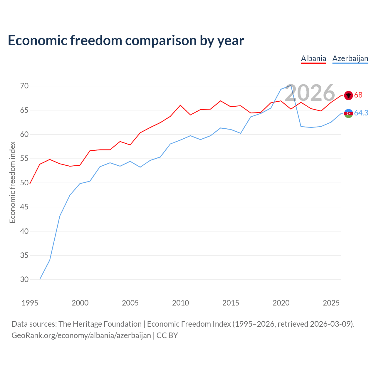 The Economic Freedom Index for Albania is 68, ranking 50/197, compared to 64.3 for Azerbaijan, ranking 74/197. The chart above displays a comparison of annual changes in economic freedom indexes.