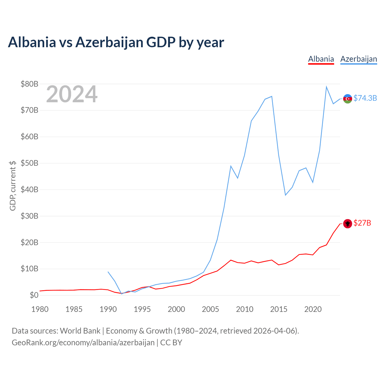 Albania has a GDP of $27B compared to $74.3B for Azerbaijan, ranking 112/197 and 84/197 by economy size, respectively.
