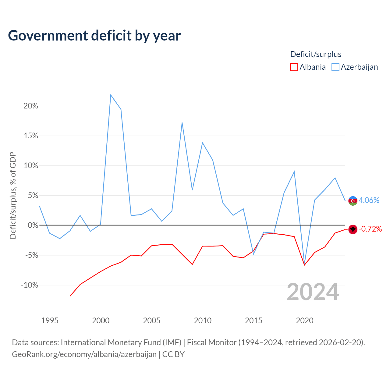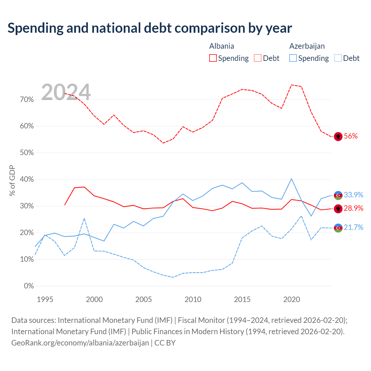 Albania has $15.2B in government debt (56% of GDP), compared to $16.1B (21.7% of GDP) in Azerbaijan.
