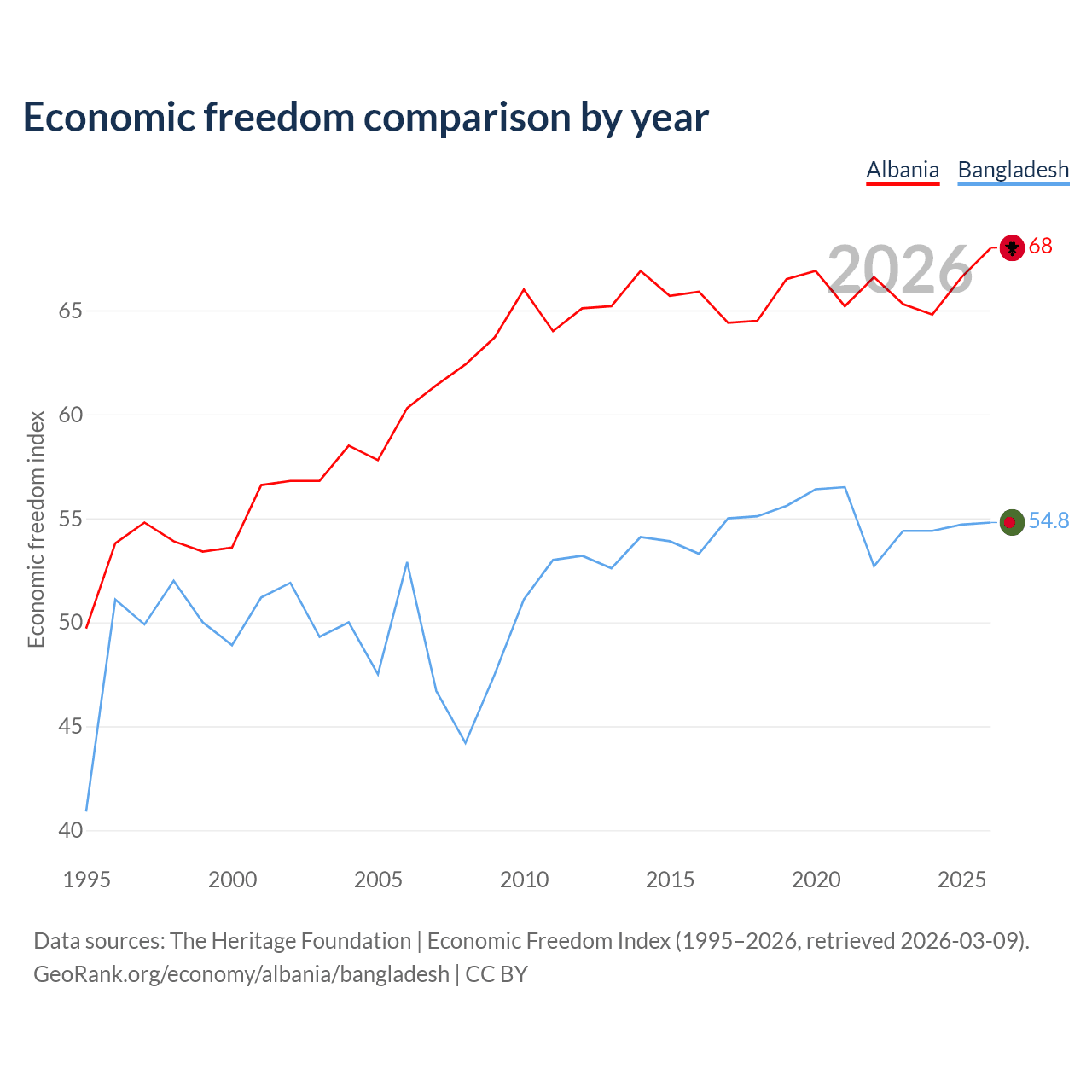 The Economic Freedom Index for Albania is 68, ranking 50/197, compared to 54.8 for Bangladesh, ranking 131/197. The chart above displays a comparison of annual changes in economic freedom indexes.