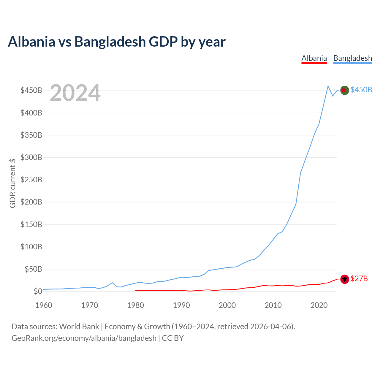Albania has a GDP of $27B compared to $450B for Bangladesh, ranking 112/197 and 36/197 by economy size, respectively.