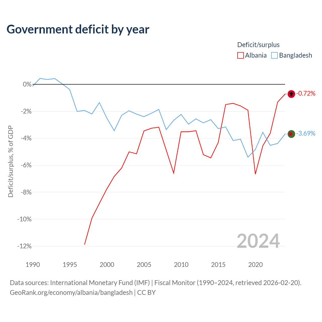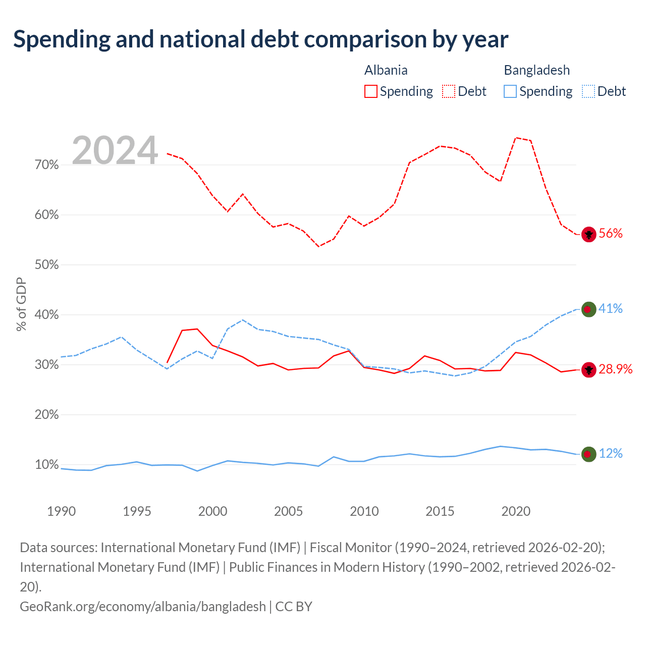 Albania has $15.2B in government debt (56% of GDP), compared to $184B (41% of GDP) in Bangladesh.