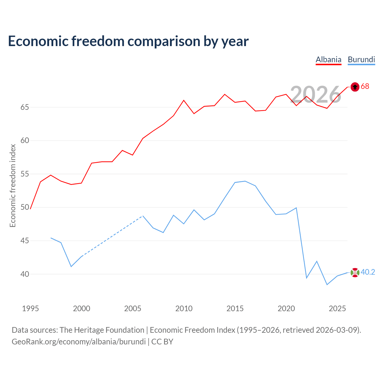 The Economic Freedom Index for Albania is 68, ranking 50/197, compared to 40.2 for Burundi, ranking 187/197. The chart above displays a comparison of annual changes in economic freedom indexes.