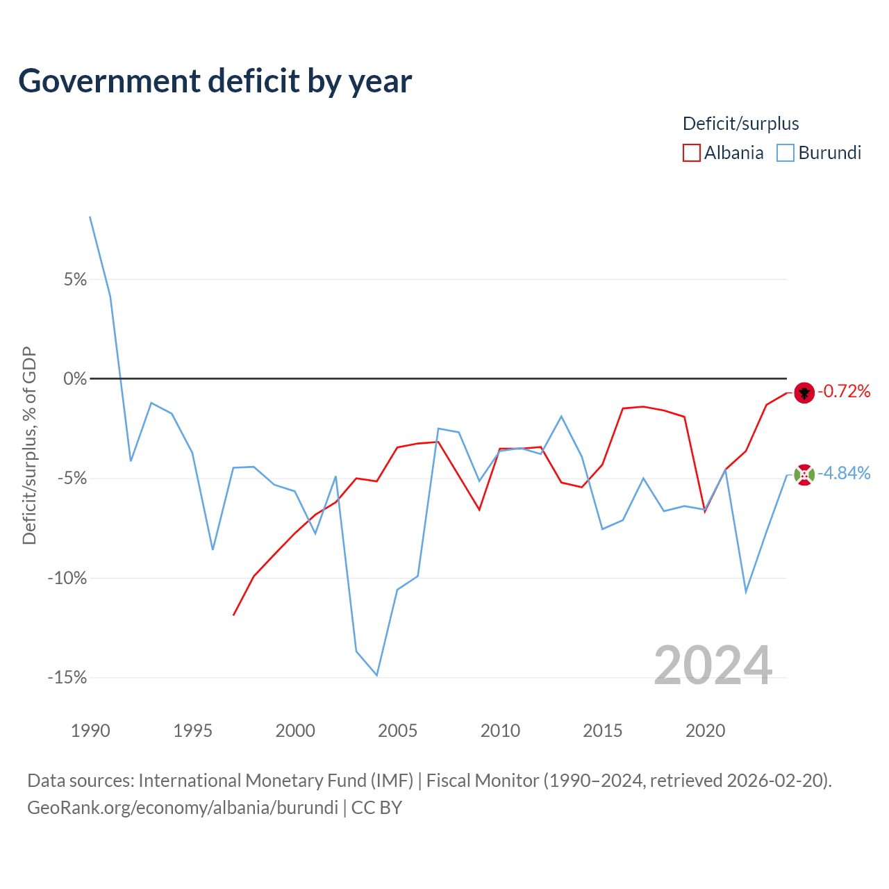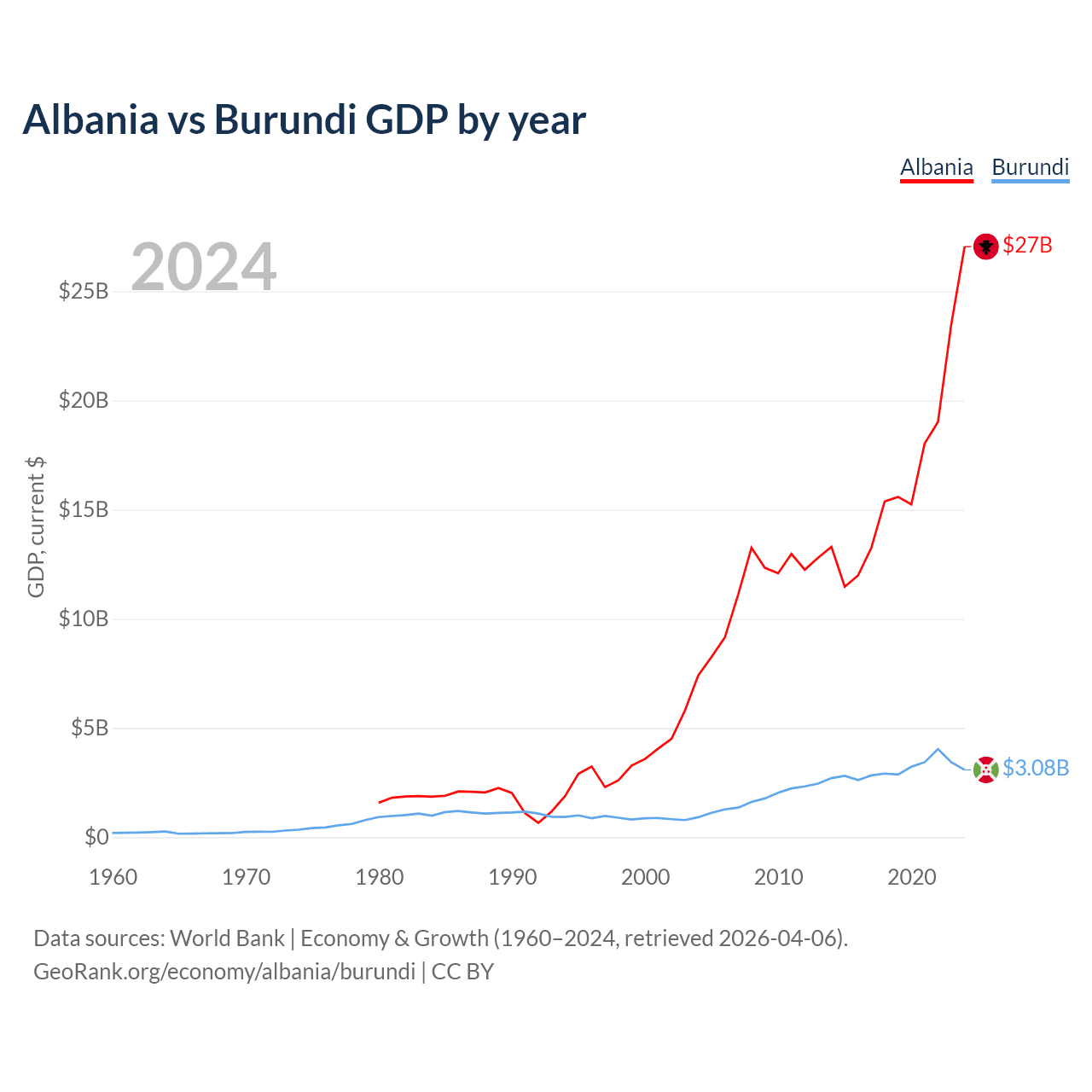 Albania has a GDP of $27B compared to $3.08B for Burundi, ranking 112/197 and 169/197 by economy size, respectively.