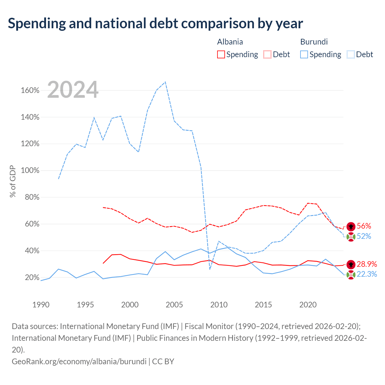Albania has $15.2B in government debt (56% of GDP), compared to $1.6B (52% of GDP) in Burundi.