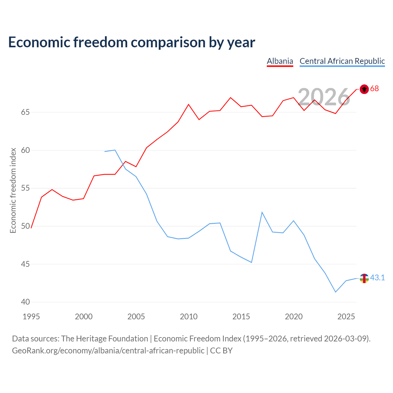 The Economic Freedom Index for Albania is 68, ranking 50/197, compared to 43.1 for the Central African Republic, ranking 182/197. The chart above displays a comparison of annual changes in economic freedom indexes.