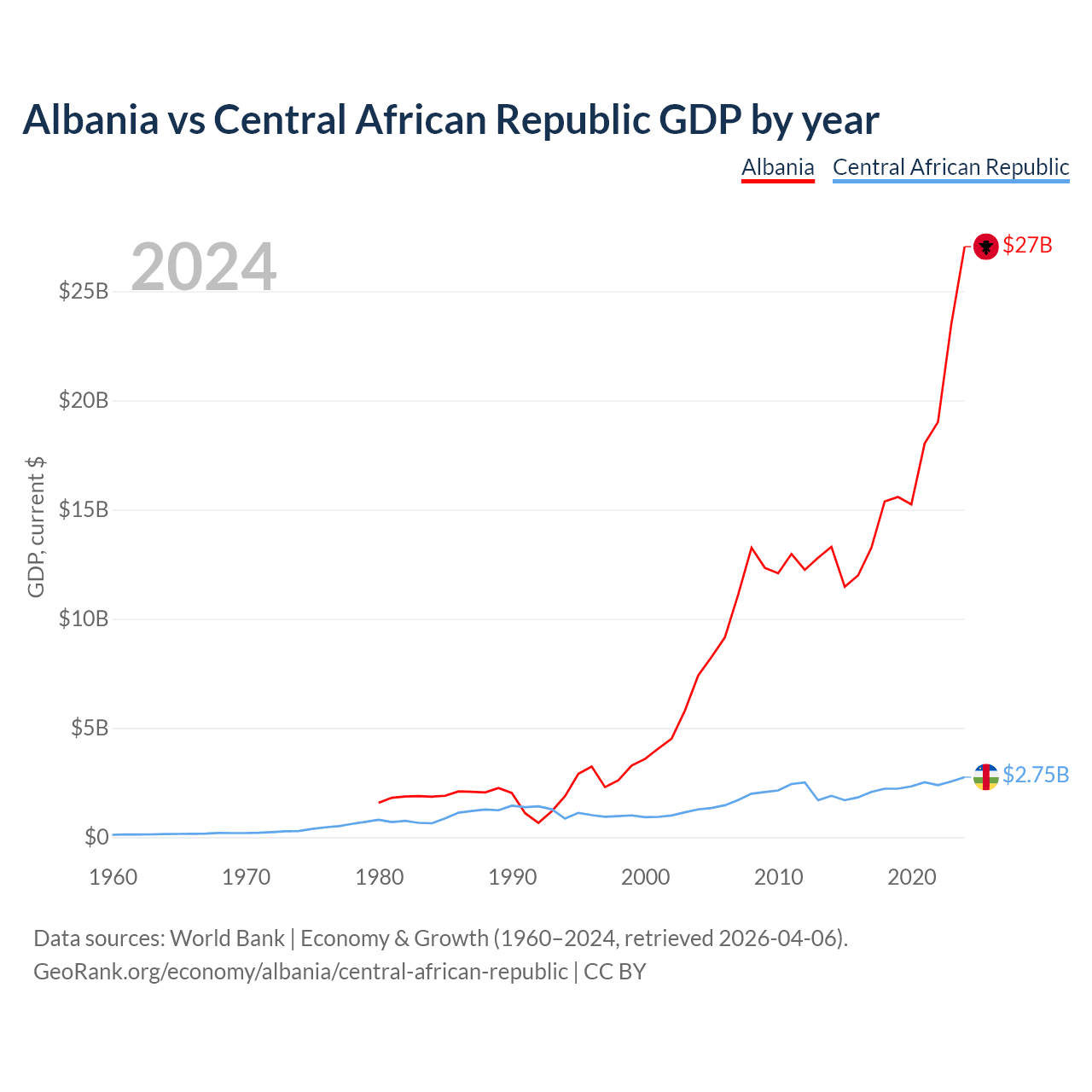 Albania has a GDP of $27B compared to $2.75B for the Central African Republic, ranking 112/197 and 171/197 by economy size, respectively.