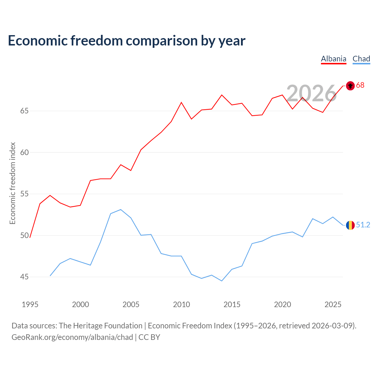 The Economic Freedom Index for Albania is 68, ranking 50/197, compared to 51.2 for Chad, ranking 154/197. The chart above displays a comparison of annual changes in economic freedom indexes.