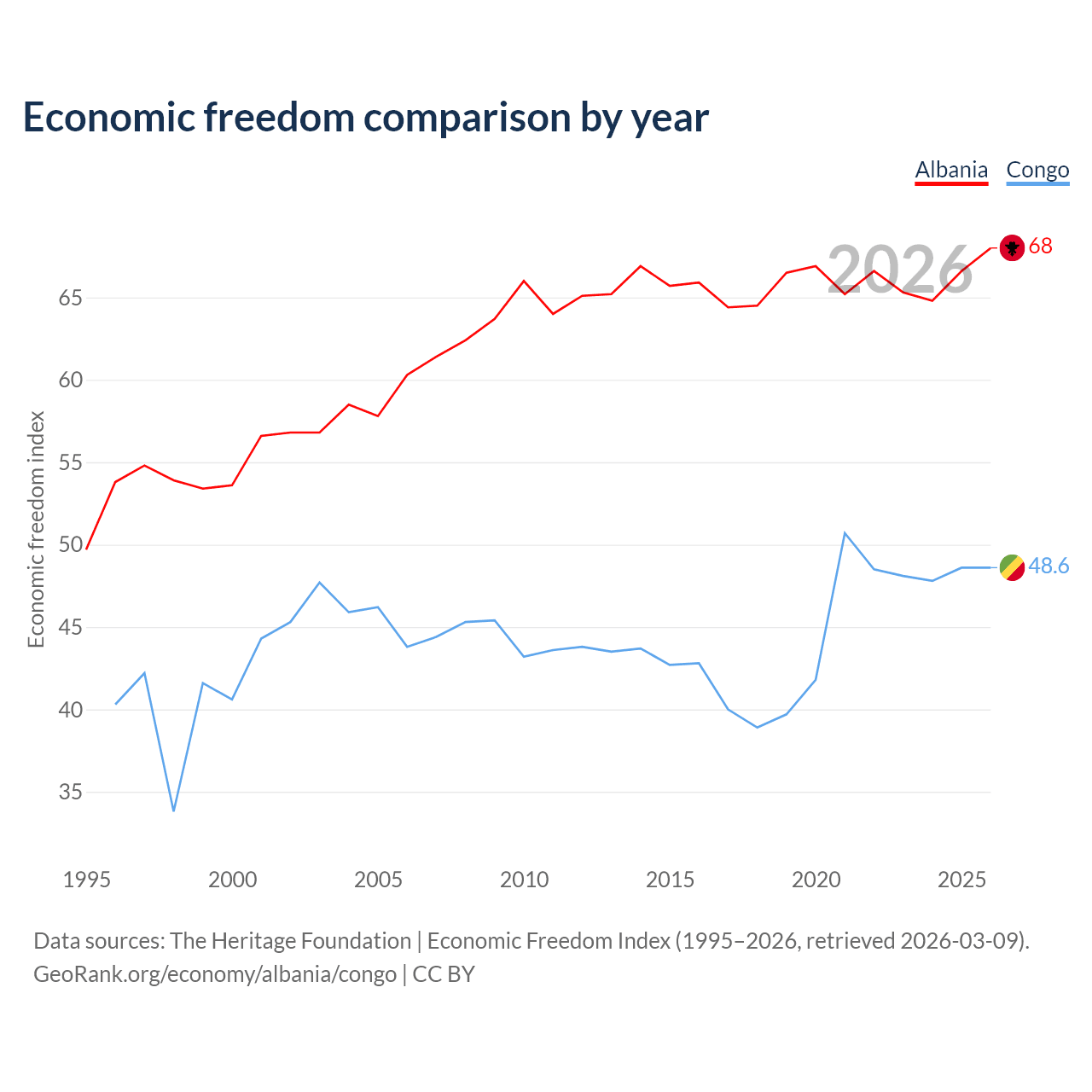 The Economic Freedom Index for Albania is 68, ranking 50/197, compared to 48.6 for the Congo, ranking 169/197. The chart above displays a comparison of annual changes in economic freedom indexes.