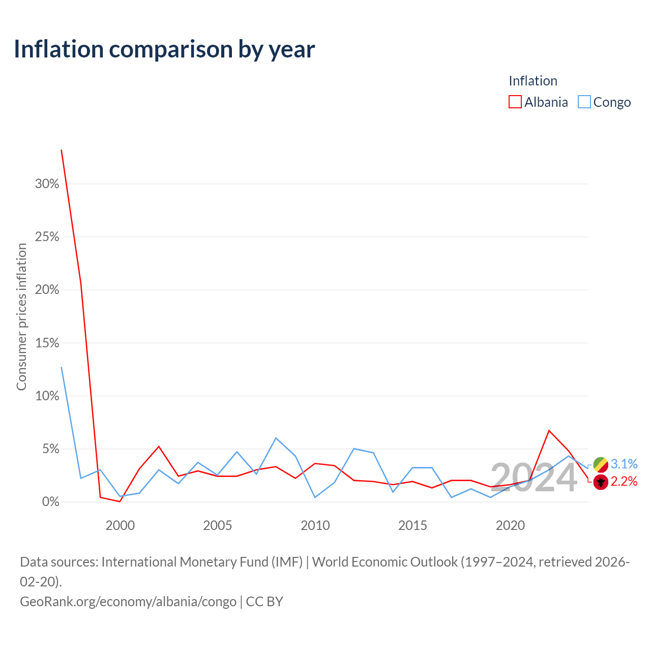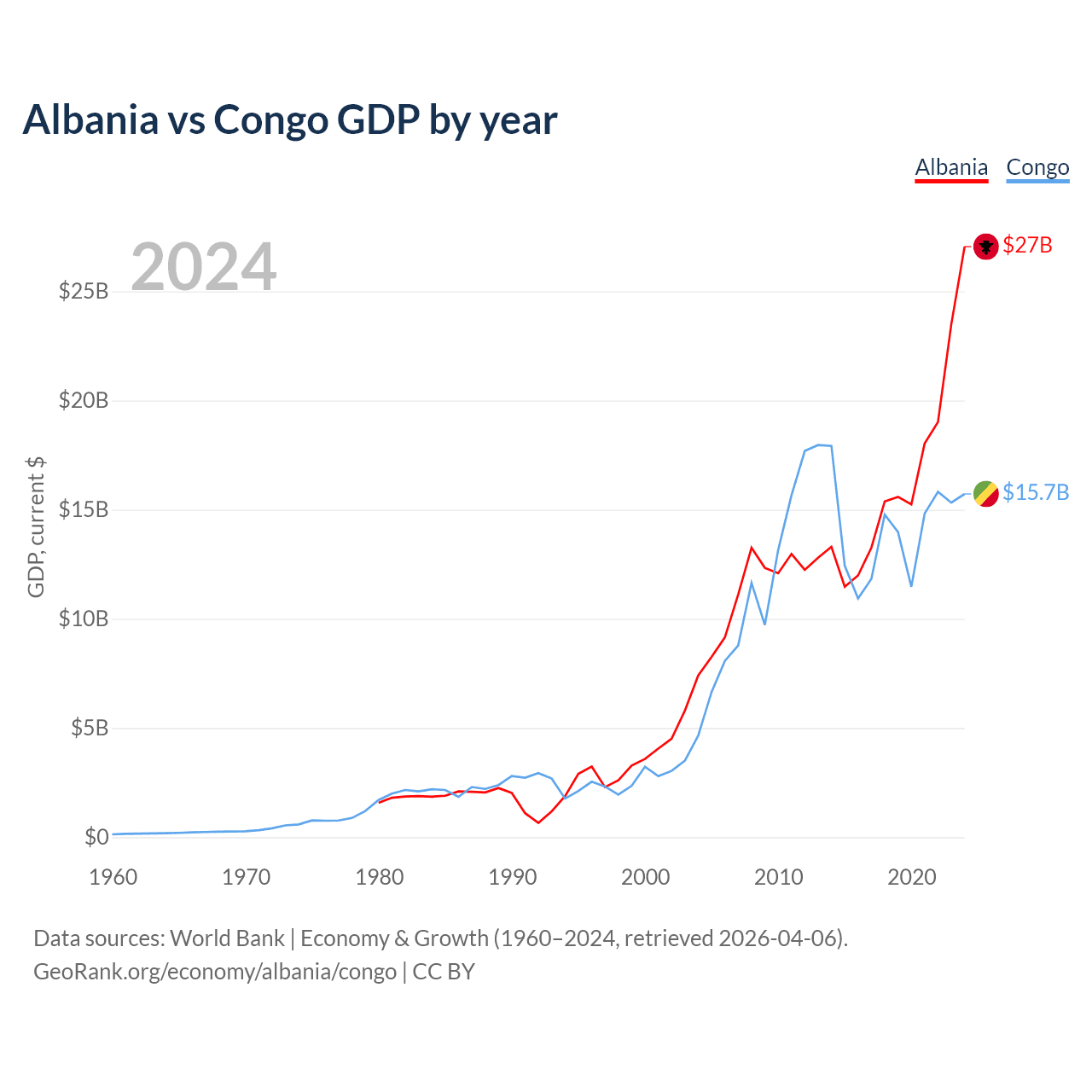 Albania has a GDP of $27B compared to $15.7B for the Congo, ranking 112/197 and 141/197 by economy size, respectively.