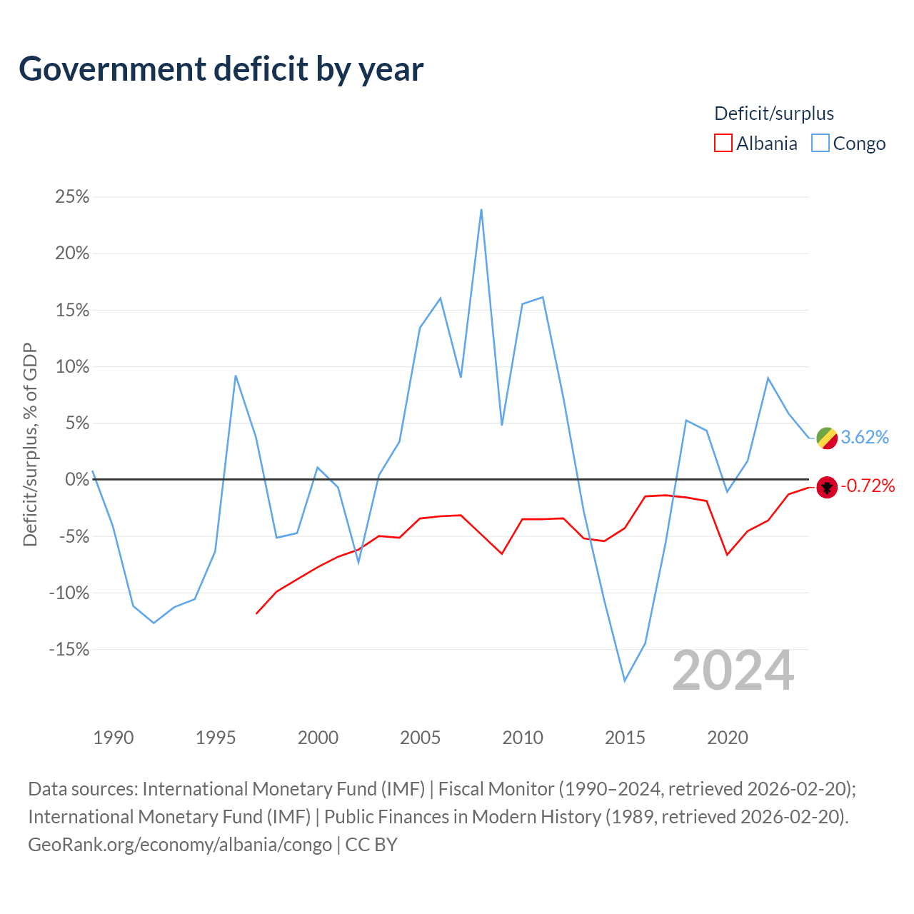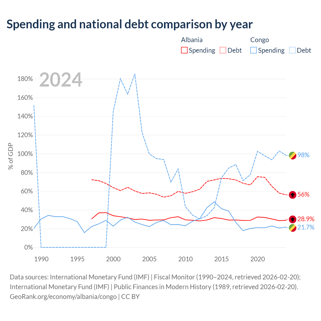 Albania has $15.2B in government debt (56% of GDP), compared to $15.4B (98% of GDP) in the Congo.