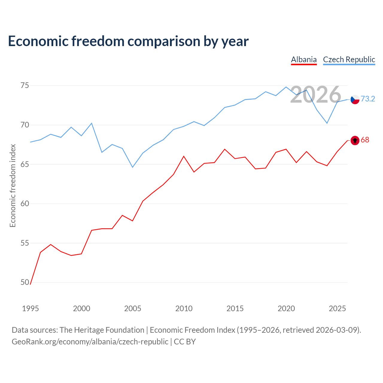 The Economic Freedom Index for Albania is 68, ranking 50/197, compared to 73.2 for the Czech Republic, ranking 25/197. The chart above displays a comparison of annual changes in economic freedom indexes.