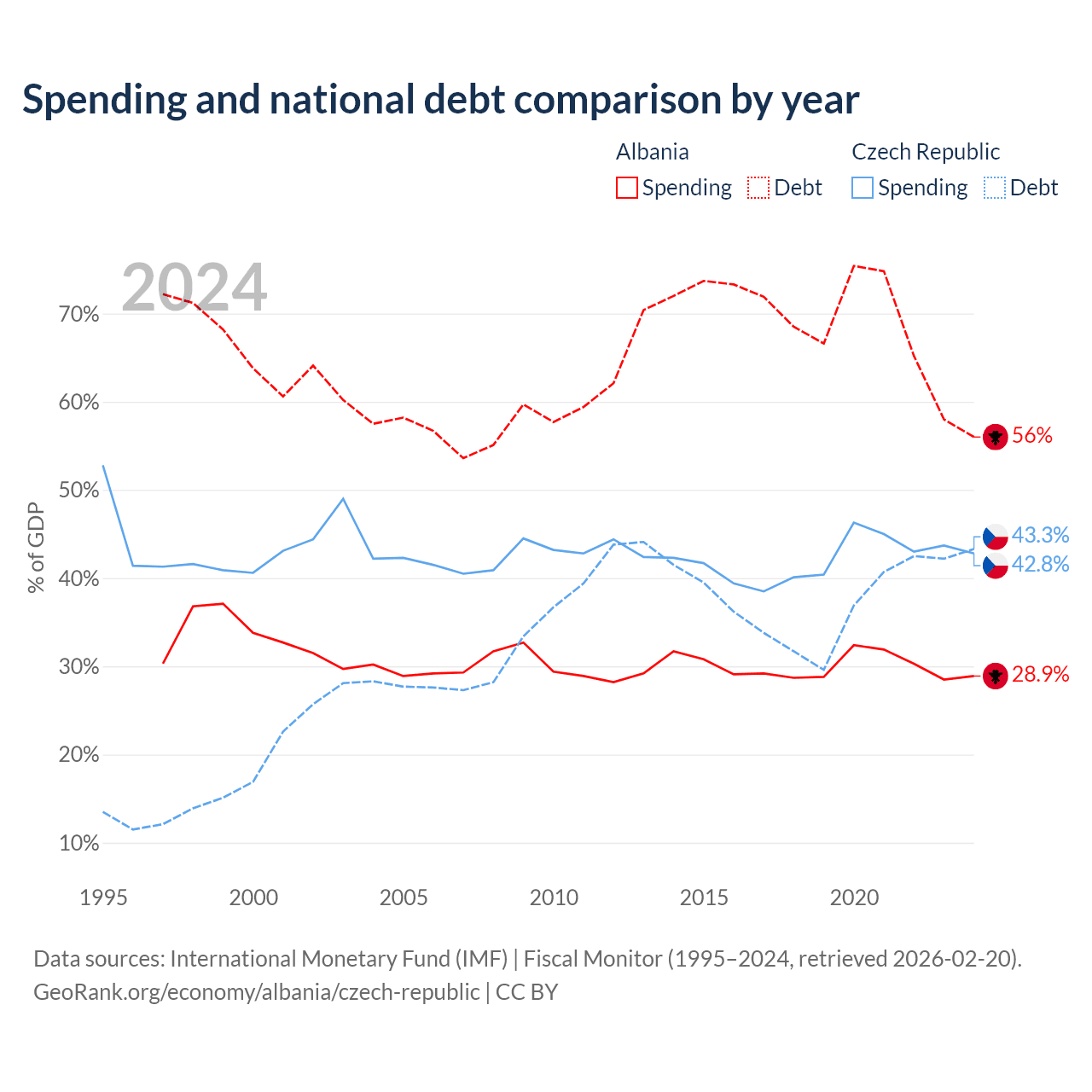 Albania has $15.2B in government debt (56% of GDP), compared to $150B (43.3% of GDP) in the Czech Republic.