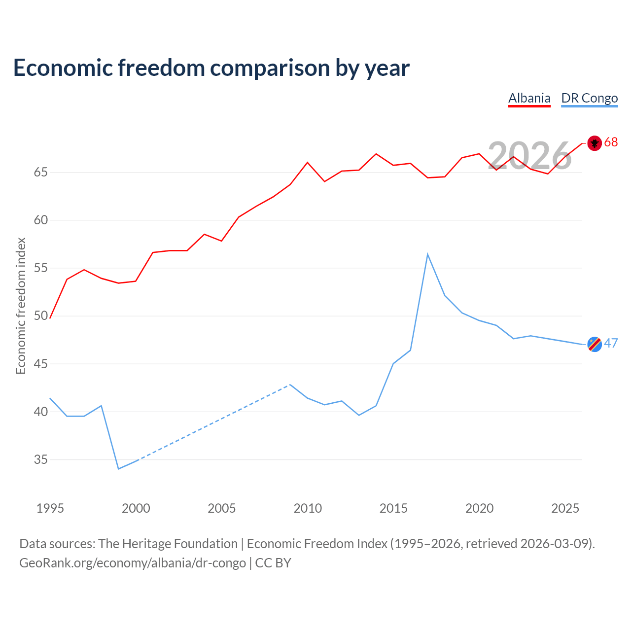 The Economic Freedom Index for Albania is 68, ranking 50/197, compared to 47 for the DR Congo, ranking 176/197. The chart above displays a comparison of annual changes in economic freedom indexes.