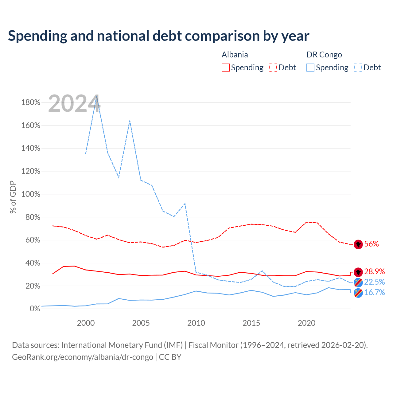 Albania has $15.2B in government debt (56% of GDP), compared to $16B (22.5% of GDP) in the DR Congo.