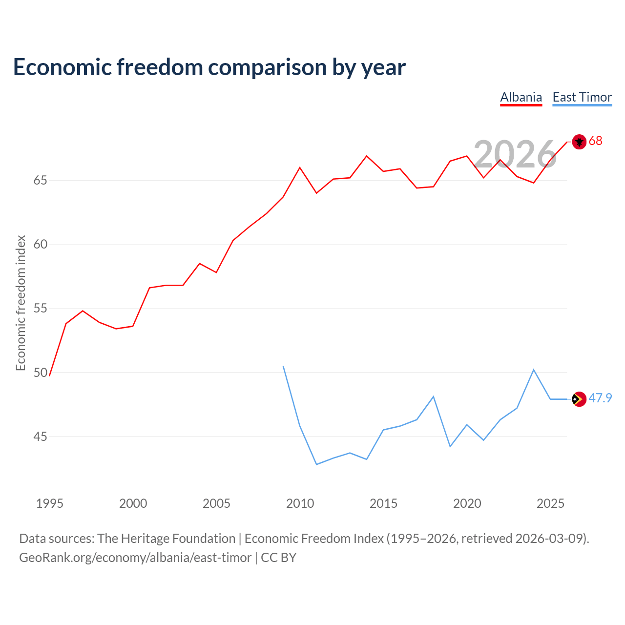 The Economic Freedom Index for Albania is 68, ranking 50/197, compared to 47.9 for East Timor, ranking 173/197. The chart above displays a comparison of annual changes in economic freedom indexes.