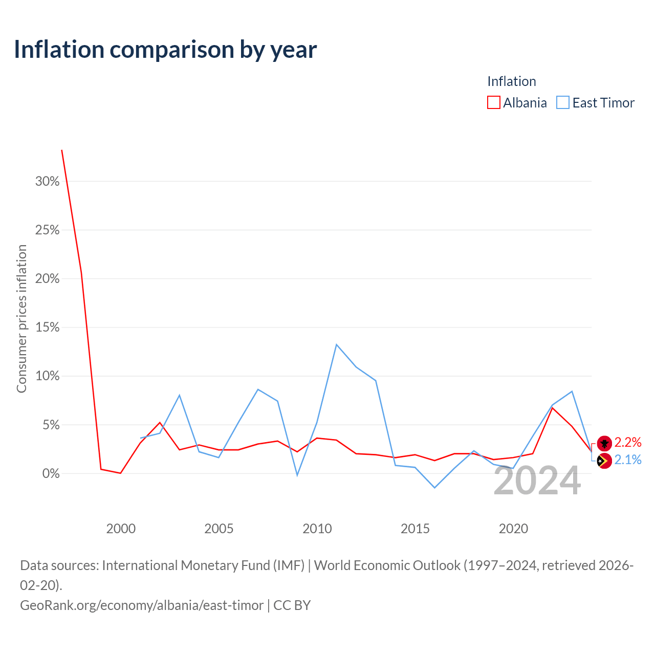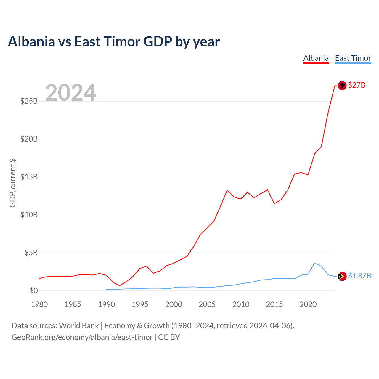 Albania has a GDP of $27B compared to $1.87B for East Timor, ranking 112/197 and 181/197 by economy size, respectively.
