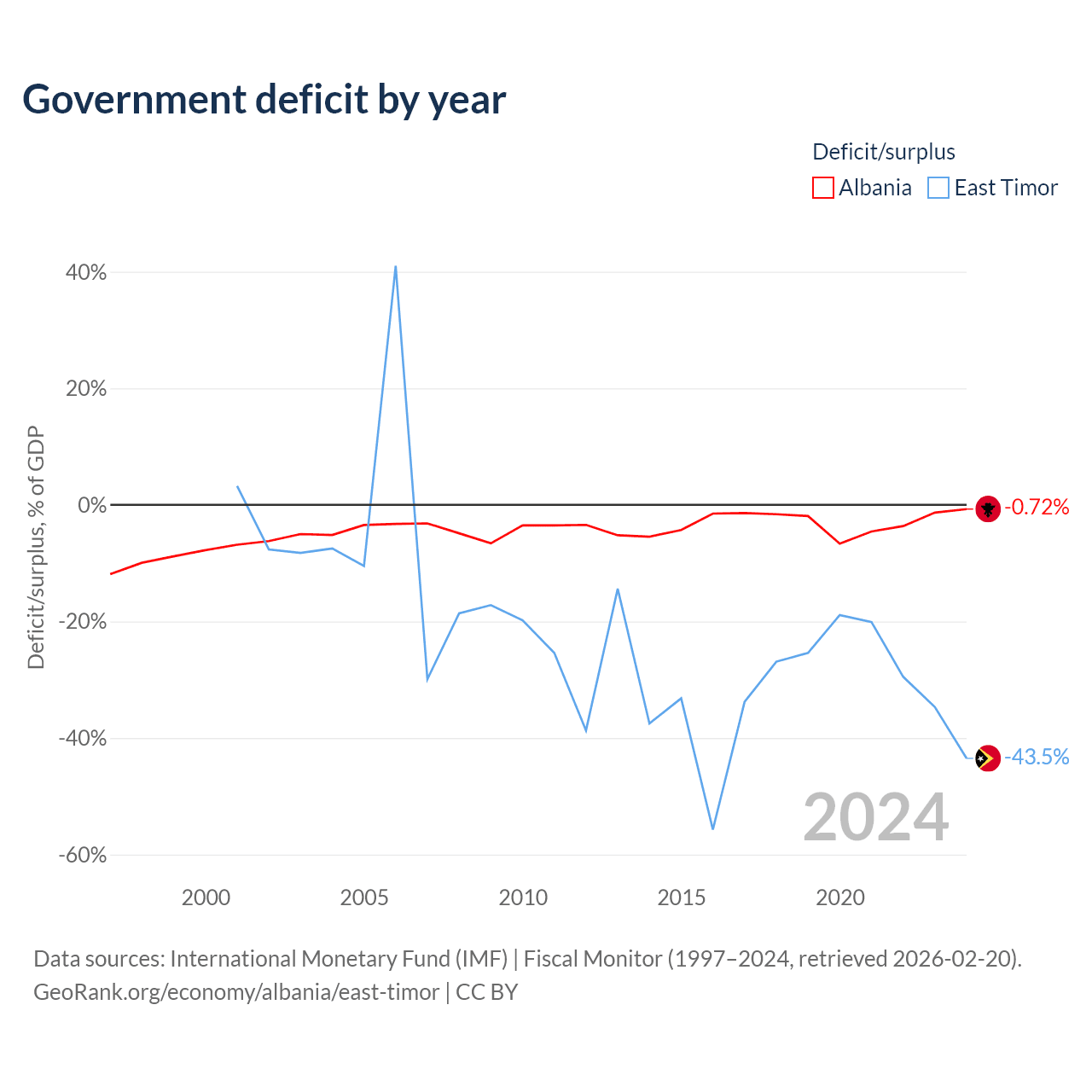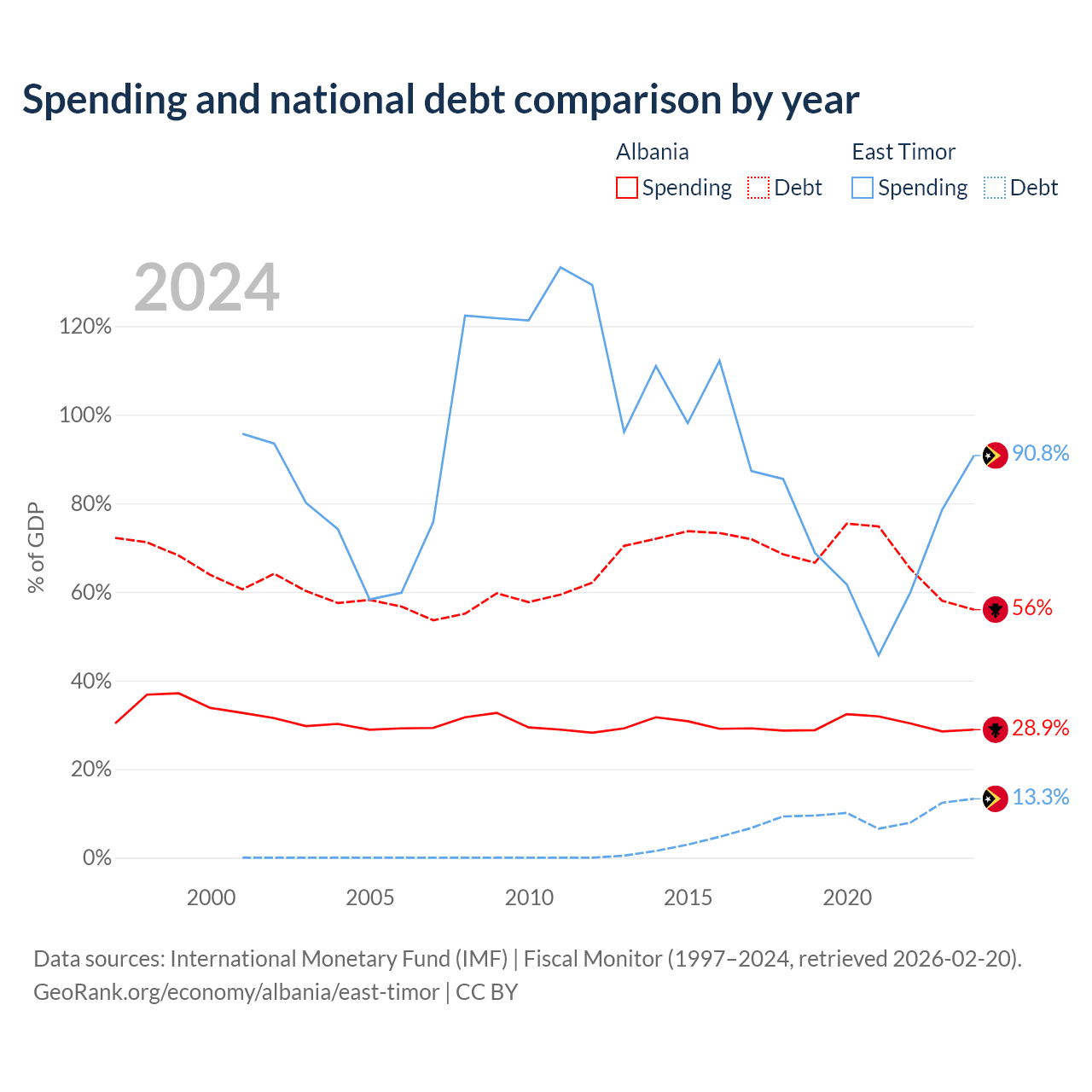 Albania has $15.2B in government debt (56% of GDP), compared to $249M (13.3% of GDP) in East Timor.