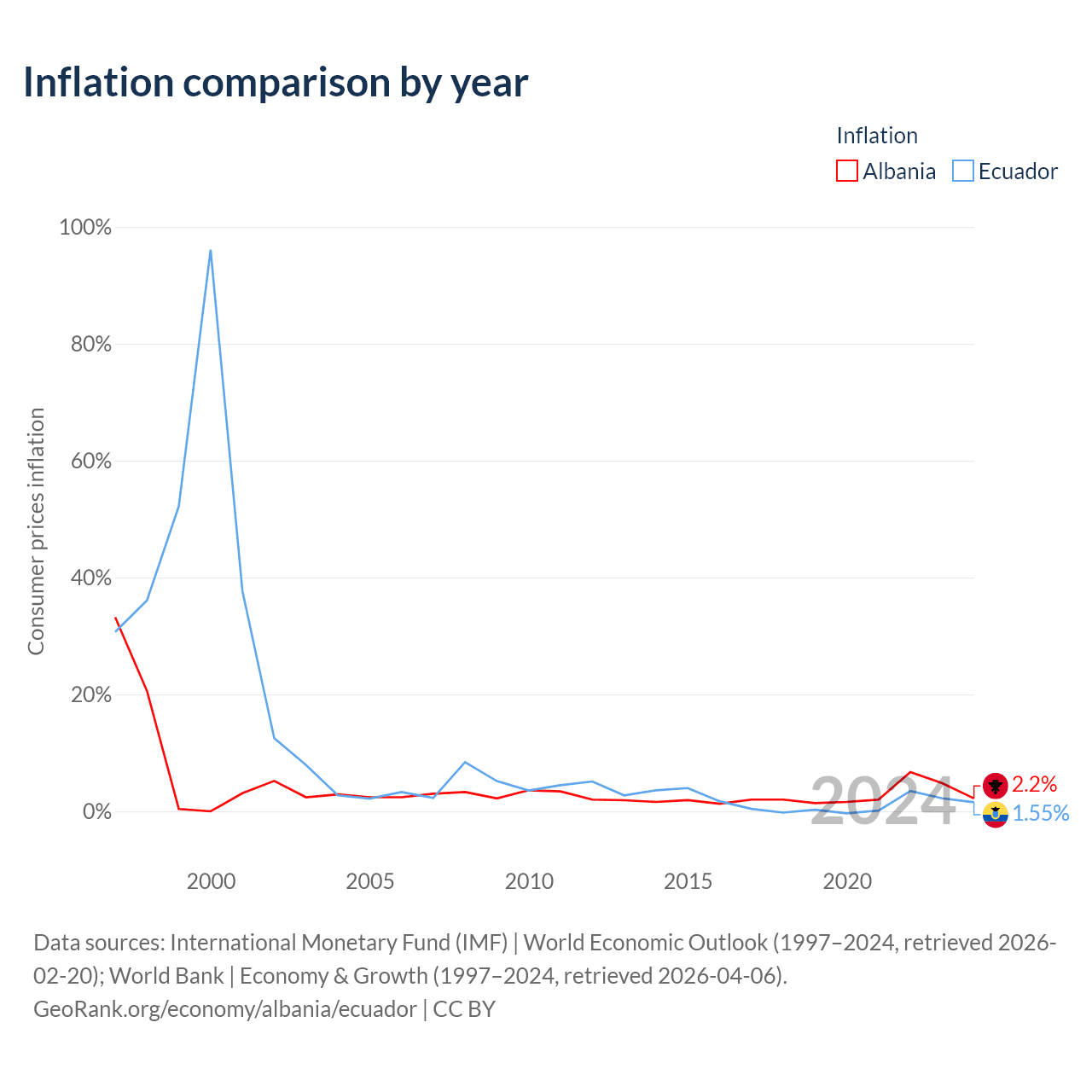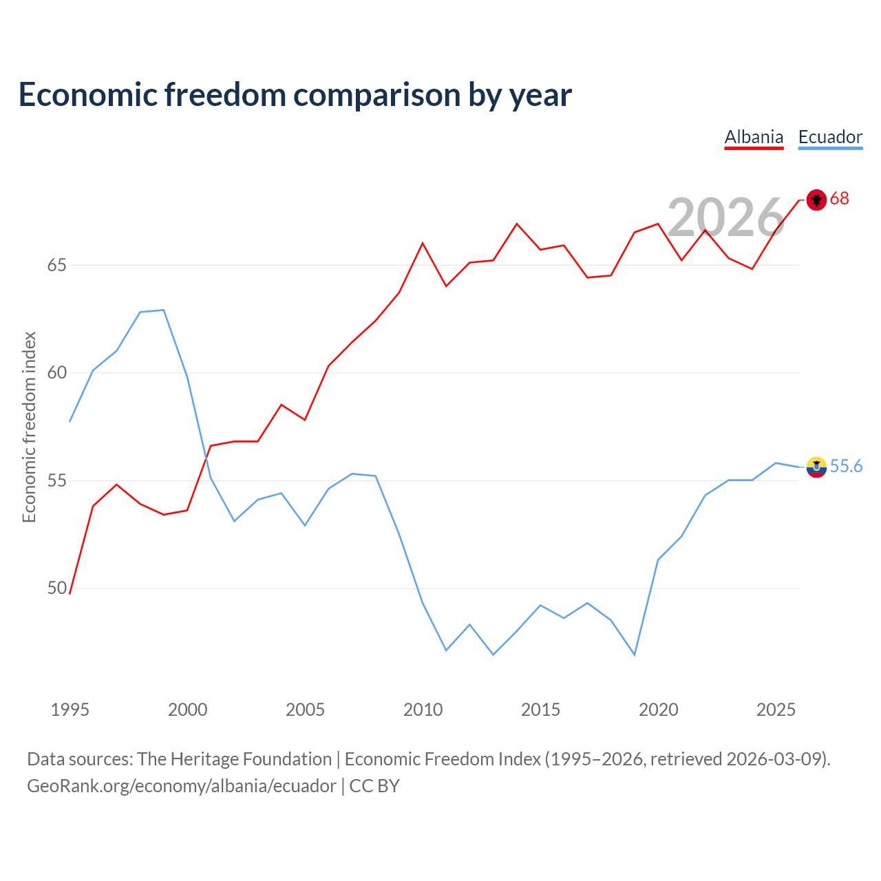 The Economic Freedom Index for Albania is 68, ranking 50/197, compared to 55.6 for Ecuador, ranking 127/197. The chart above displays a comparison of annual changes in economic freedom indexes.
