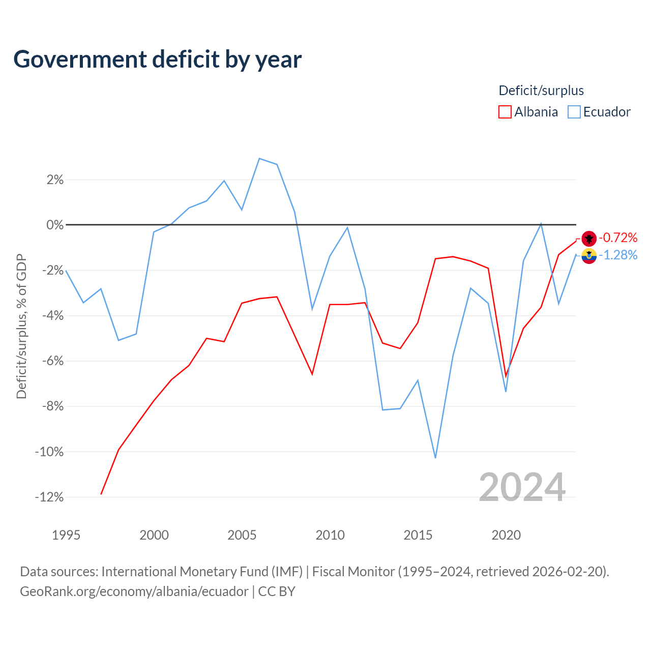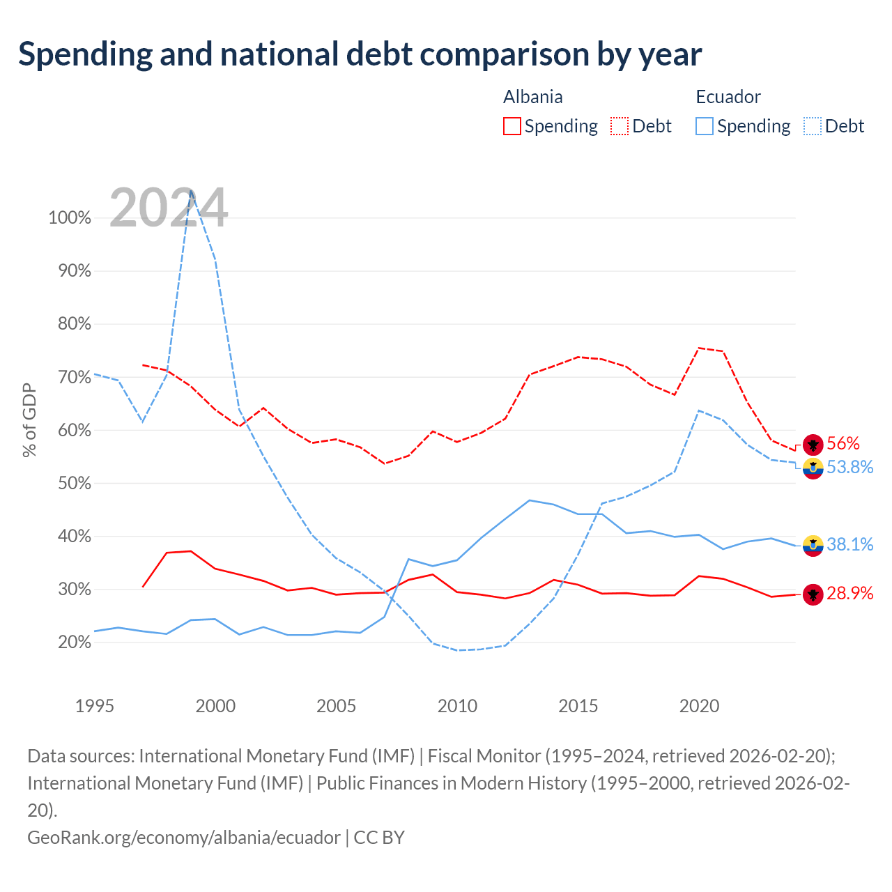 Albania has $15.2B in government debt (56% of GDP), compared to $67B (53.8% of GDP) in Ecuador.