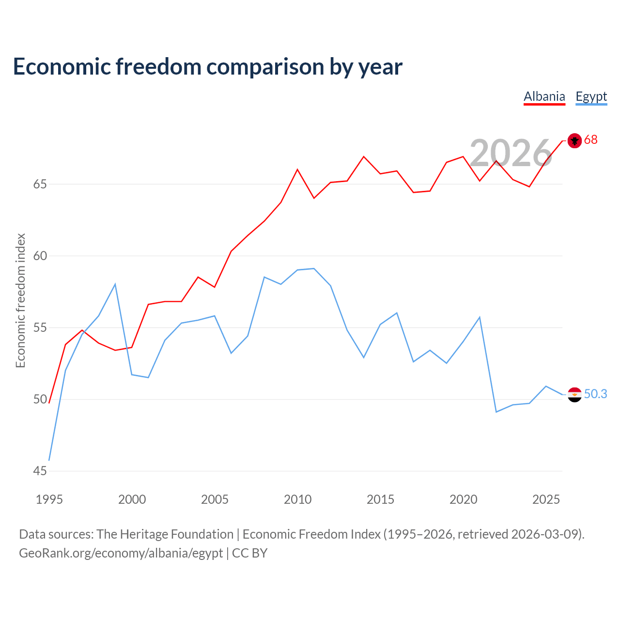 The Economic Freedom Index for Albania is 68, ranking 50/197, compared to 50.3 for Egypt, ranking 160/197. The chart above displays a comparison of annual changes in economic freedom indexes.