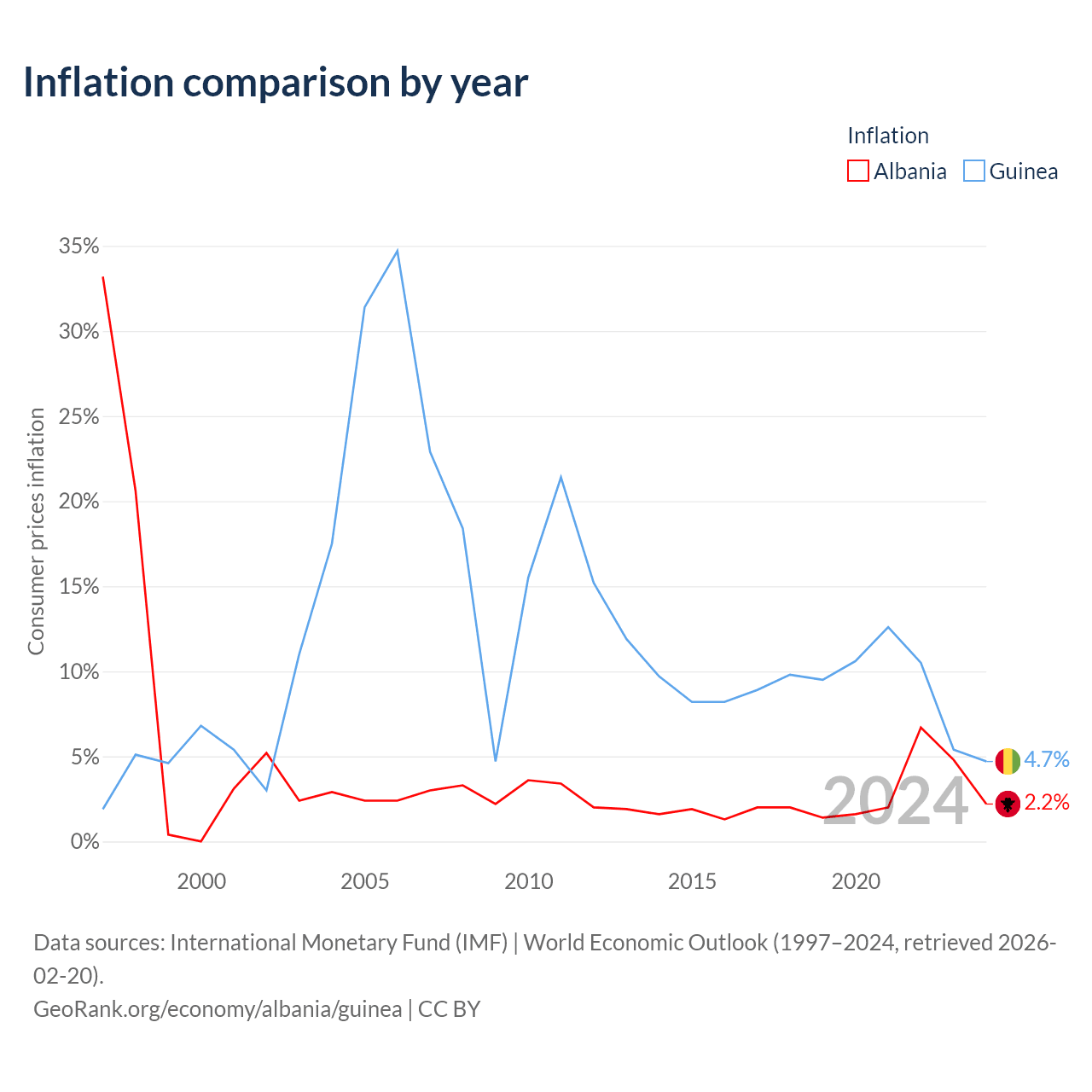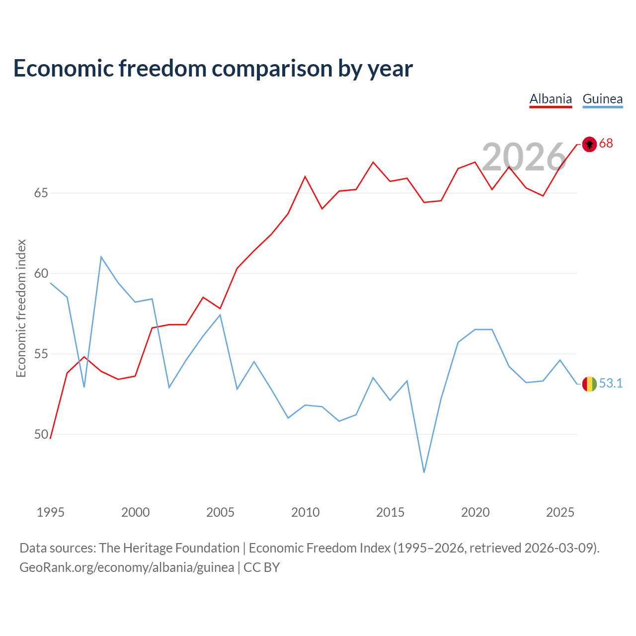 The Economic Freedom Index for Albania is 68, ranking 50/197, compared to 53.1 for Guinea, ranking 141/197. The chart above displays a comparison of annual changes in economic freedom indexes.