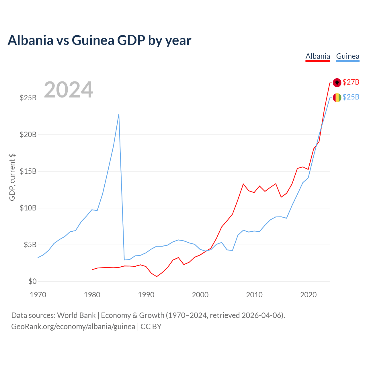 Albania has a GDP of $27B compared to $25B for Guinea, ranking 112/197 and 118/197 by economy size, respectively.