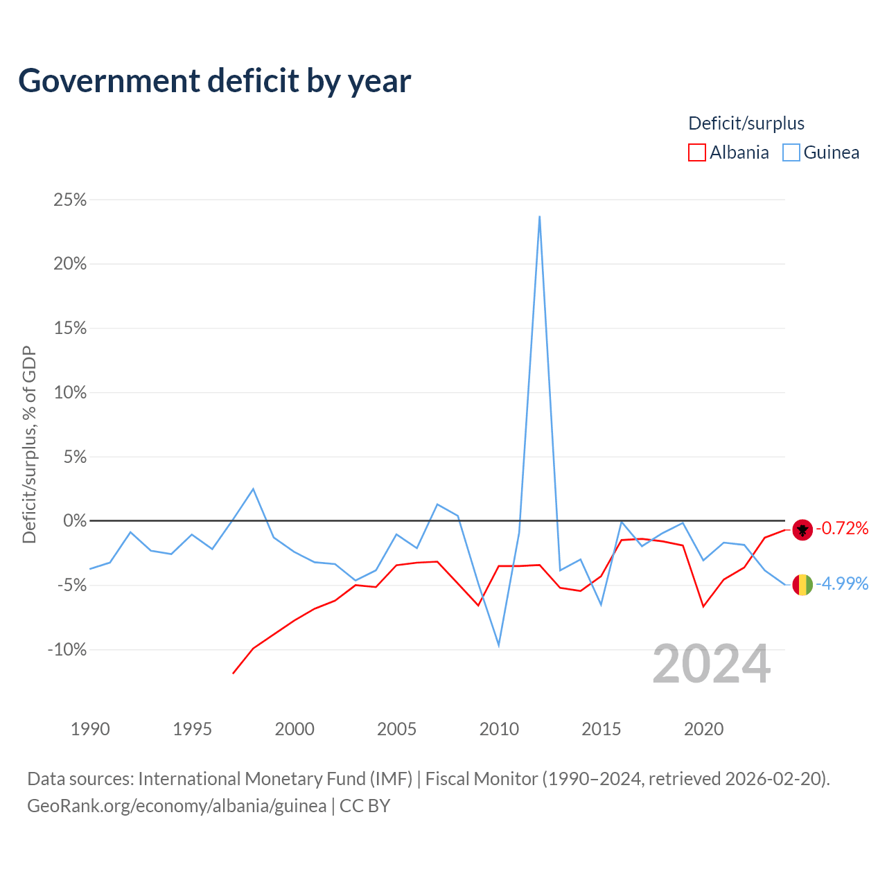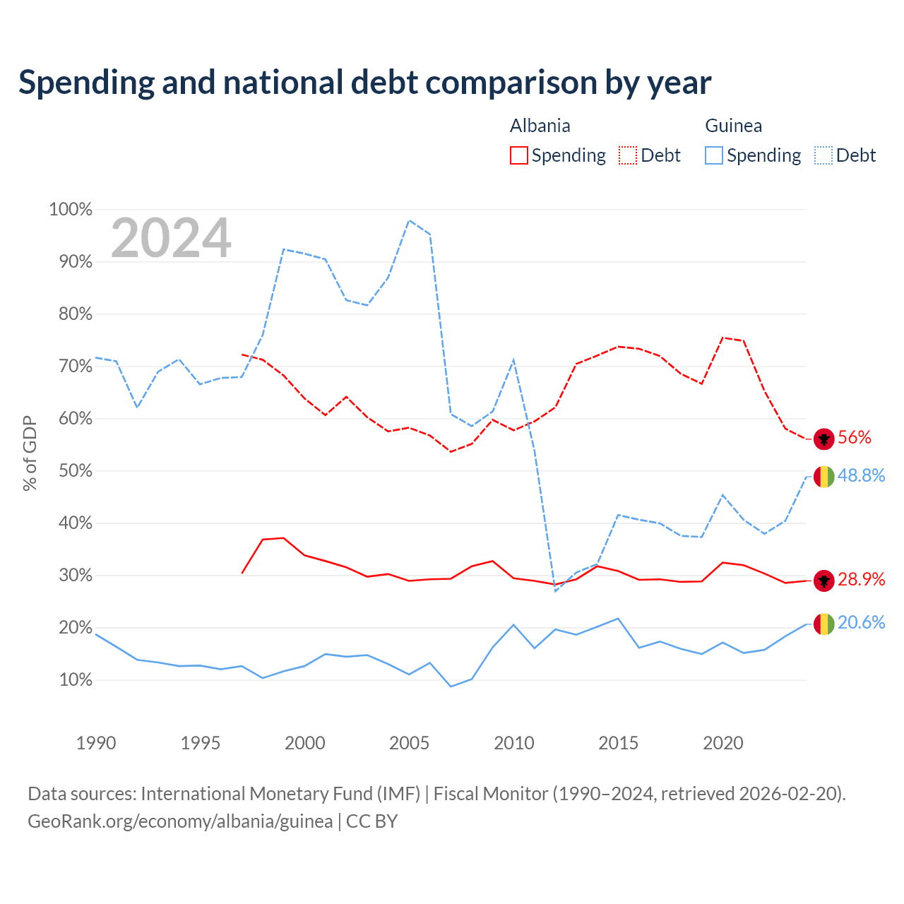 Albania has $15.2B in government debt (56% of GDP), compared to $12.2B (48.8% of GDP) in Guinea.