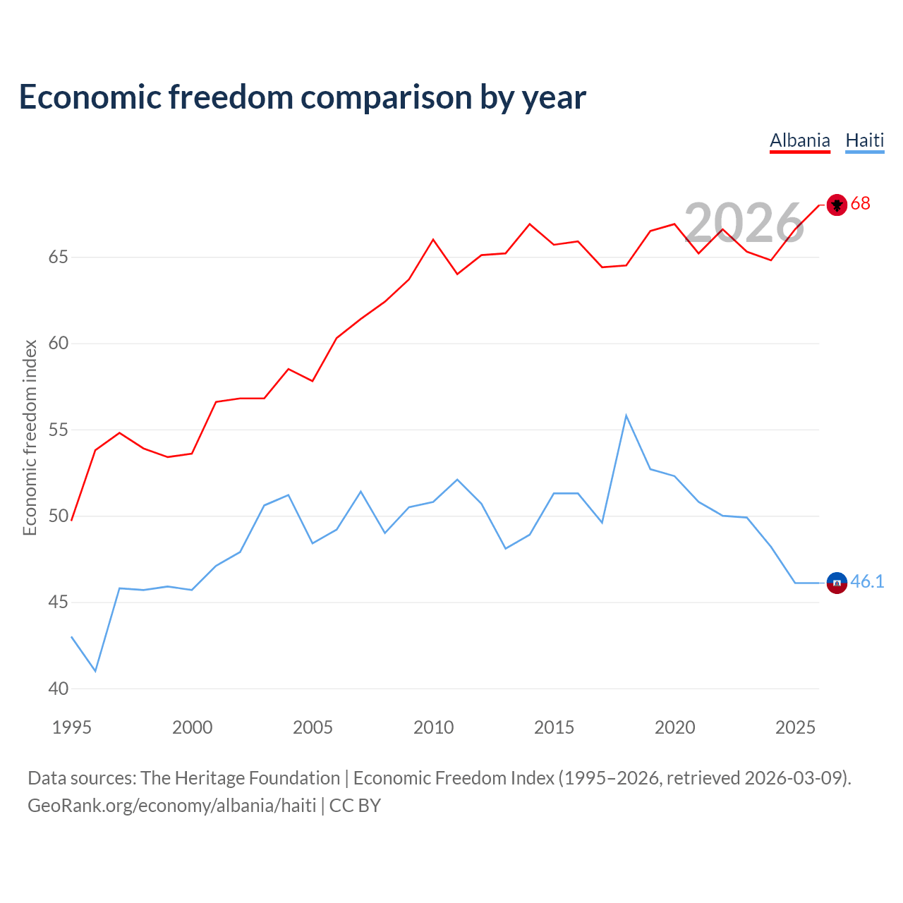 The Economic Freedom Index for Albania is 68, ranking 50/197, compared to 46.1 for Haiti, ranking 178/197. The chart above displays a comparison of annual changes in economic freedom indexes.