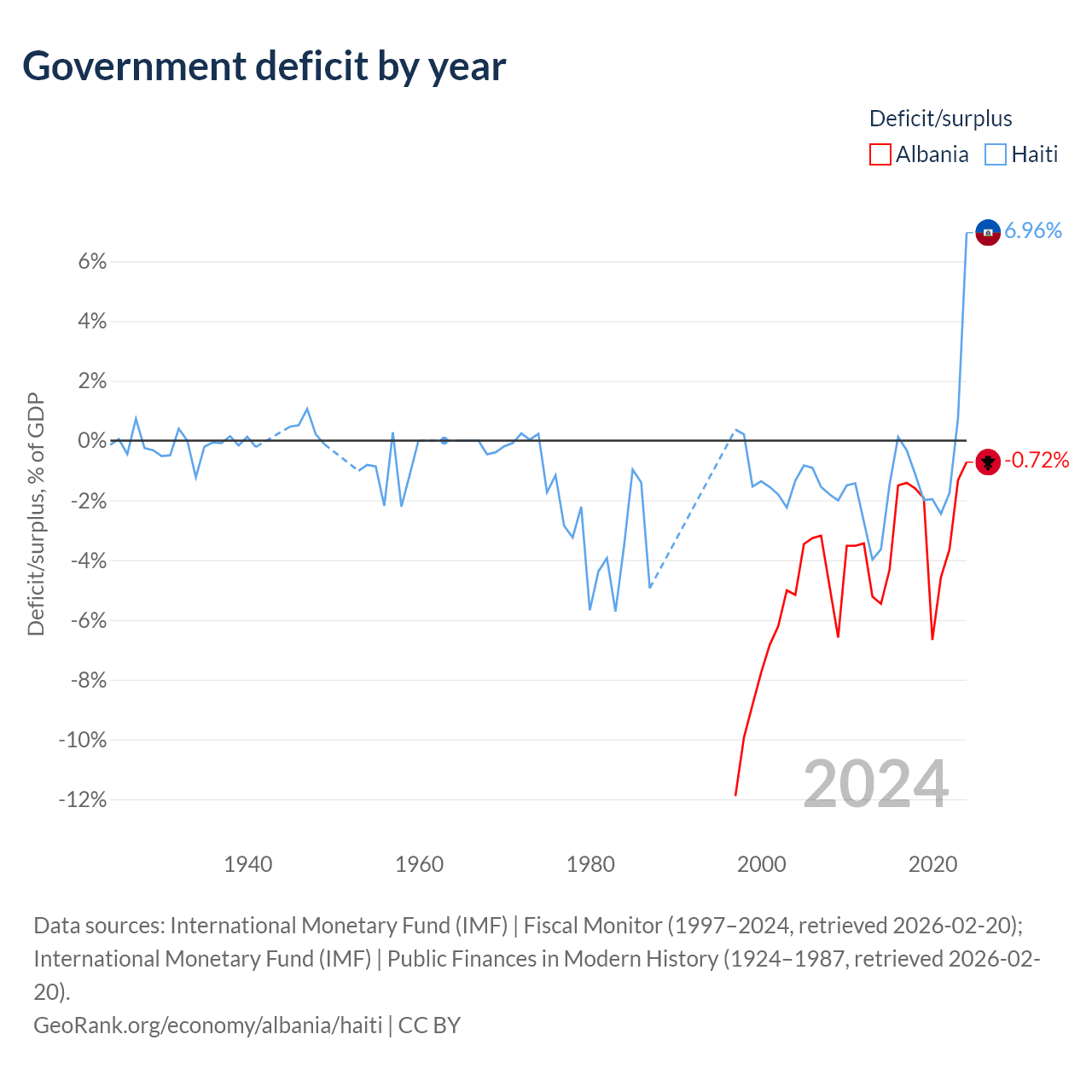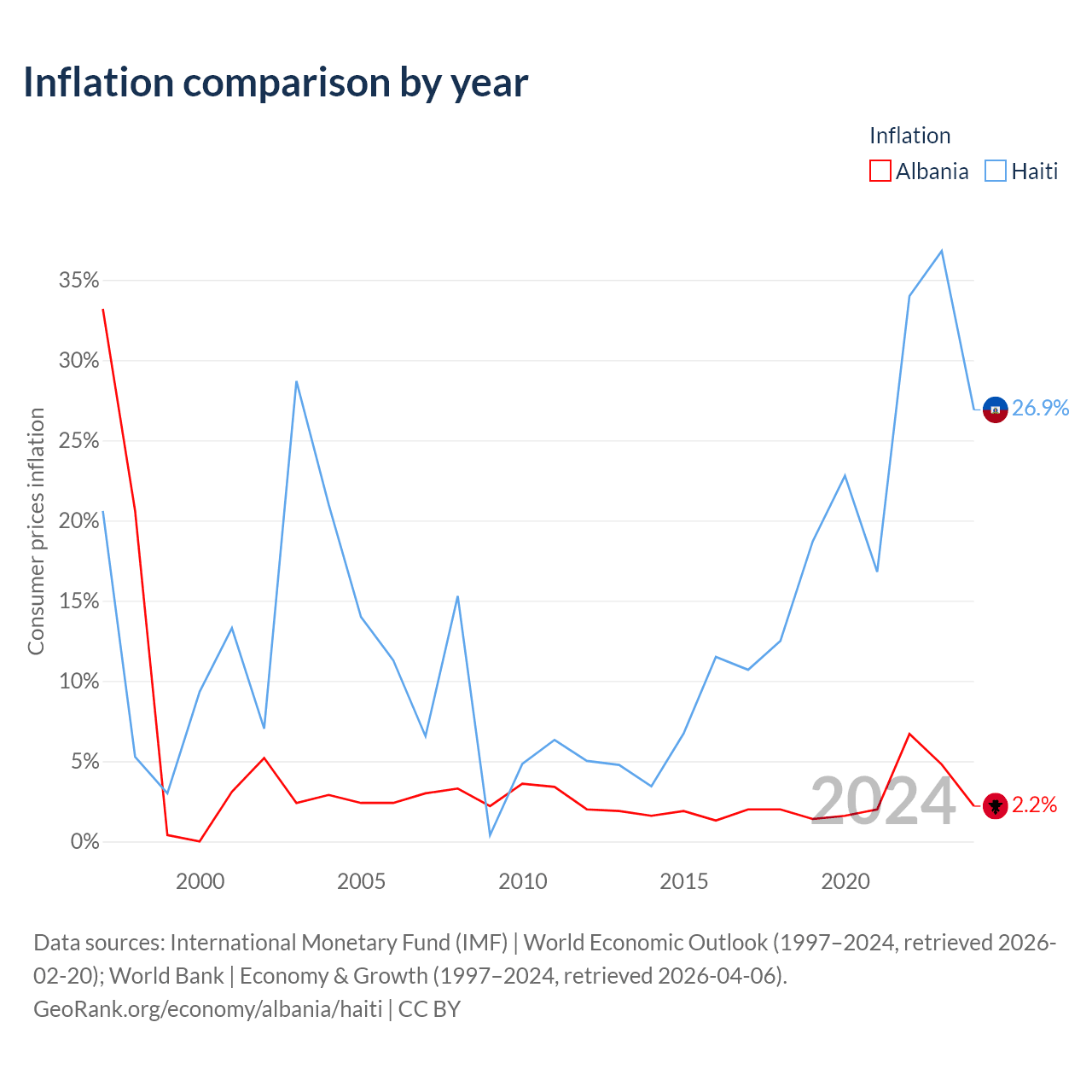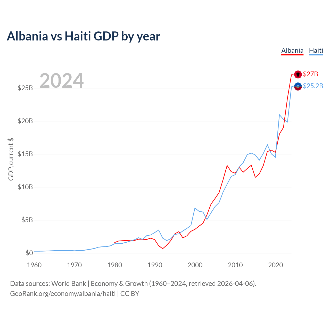 Albania has a GDP of $27B compared to $25.2B for Haiti, ranking 112/197 and 117/197 by economy size, respectively.