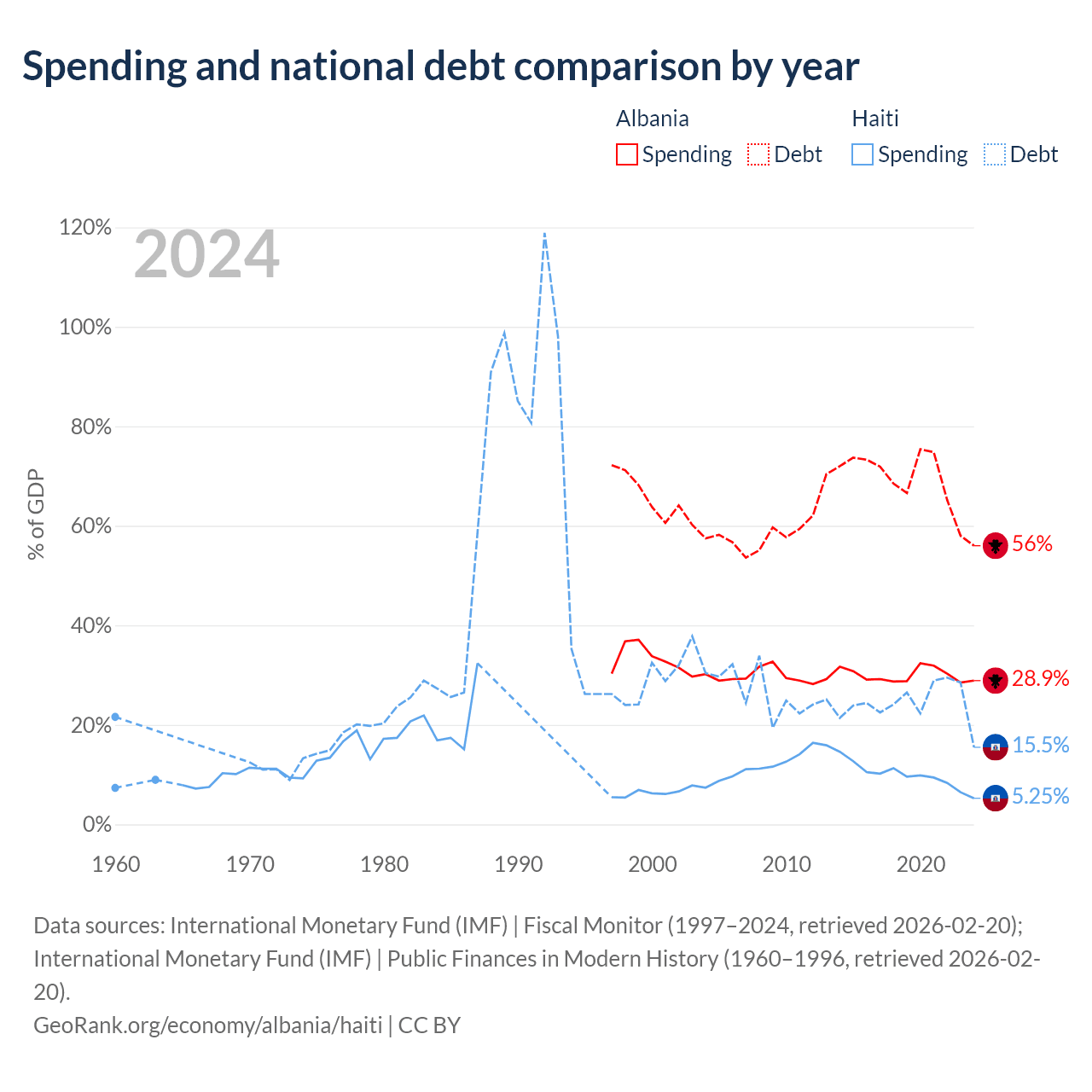 Albania has $15.2B in government debt (56% of GDP), compared to $3.91B (15.5% of GDP) in Haiti.