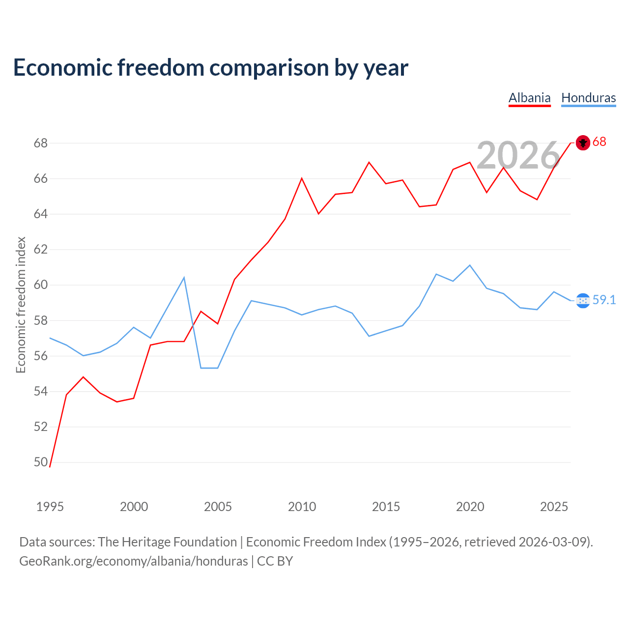 The Economic Freedom Index for Albania is 68, ranking 50/197, compared to 59.1 for Honduras, ranking 105/197. The chart above displays a comparison of annual changes in economic freedom indexes.