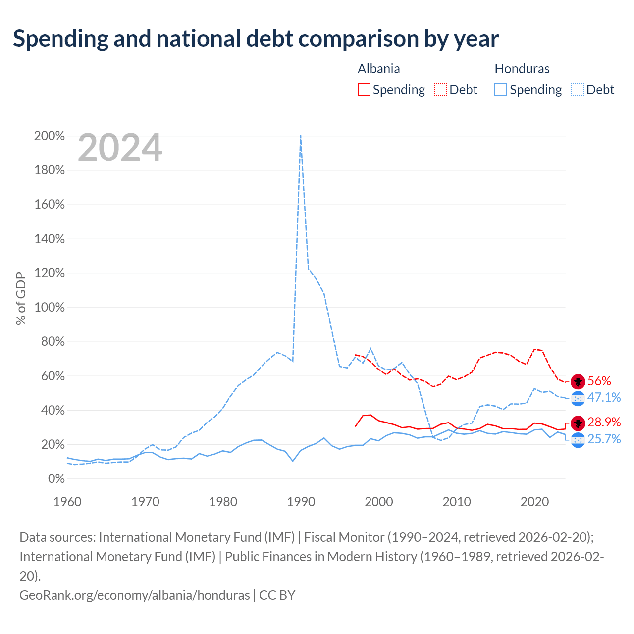 Albania has $15.2B in government debt (56% of GDP), compared to $17.5B (47.1% of GDP) in Honduras.