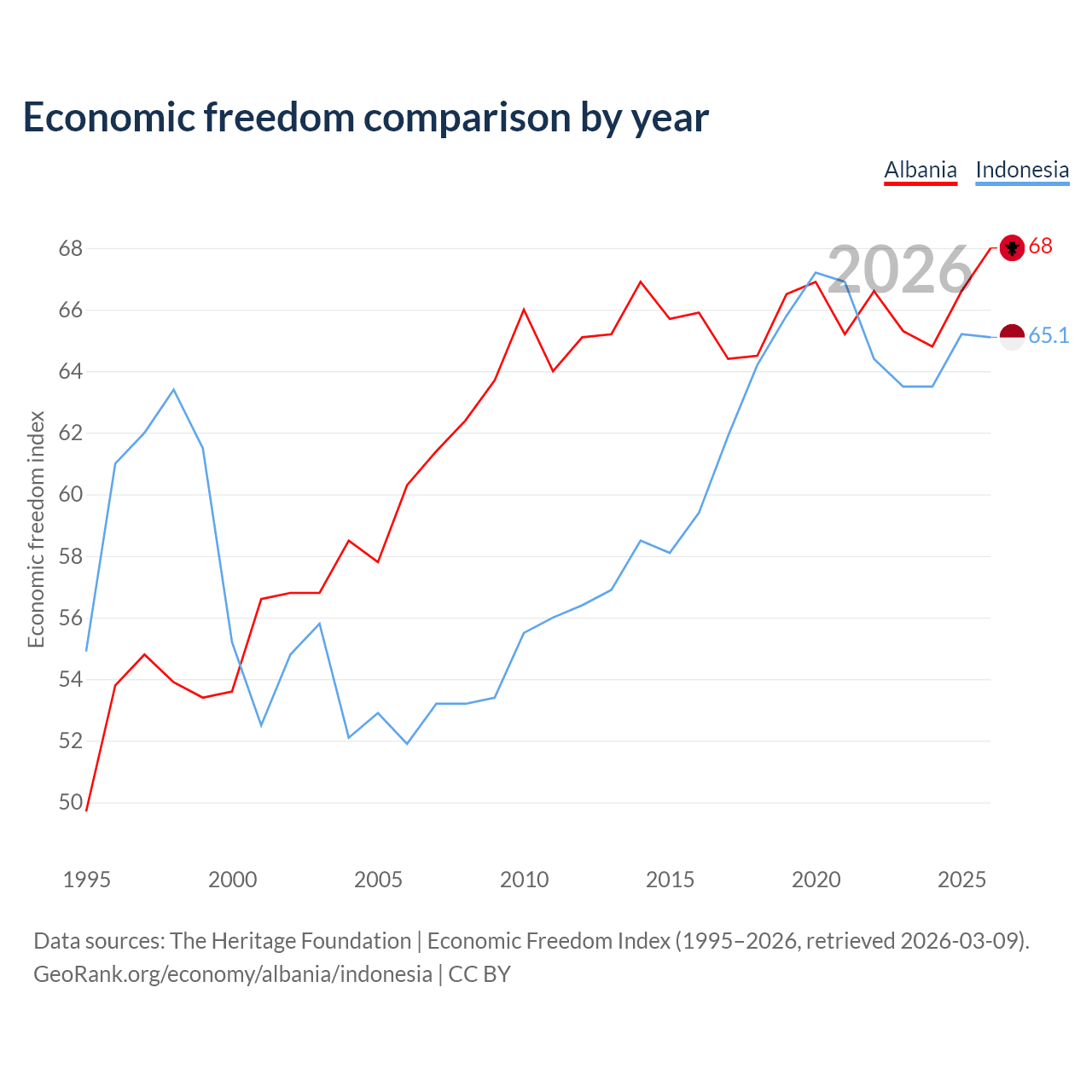 The Economic Freedom Index for Albania is 68, ranking 50/197, compared to 65.1 for Indonesia, ranking 67/197. The chart above displays a comparison of annual changes in economic freedom indexes.