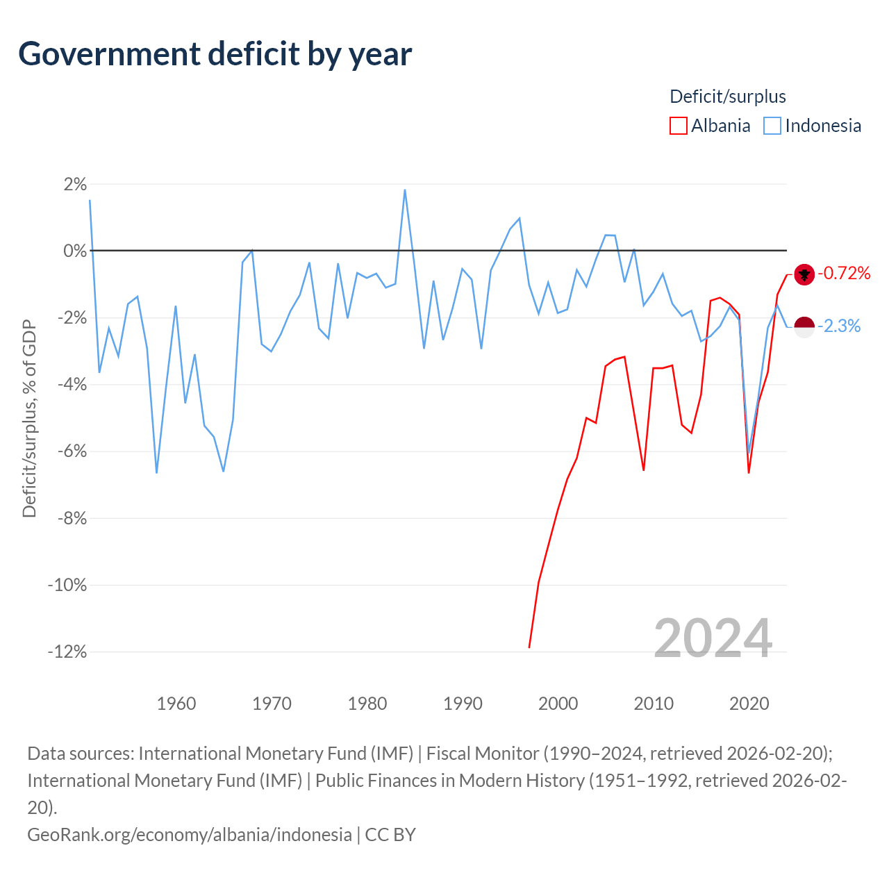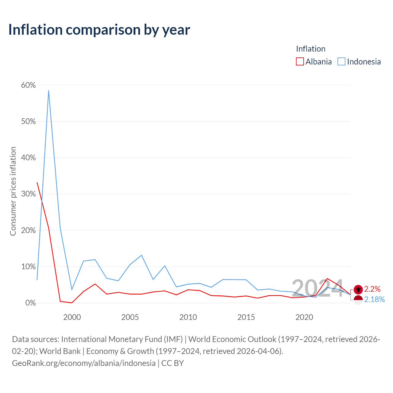 Albania has a GDP of $27B compared to $1.4T for Indonesia, ranking 112/197 and 16/197 by economy size, respectively.
