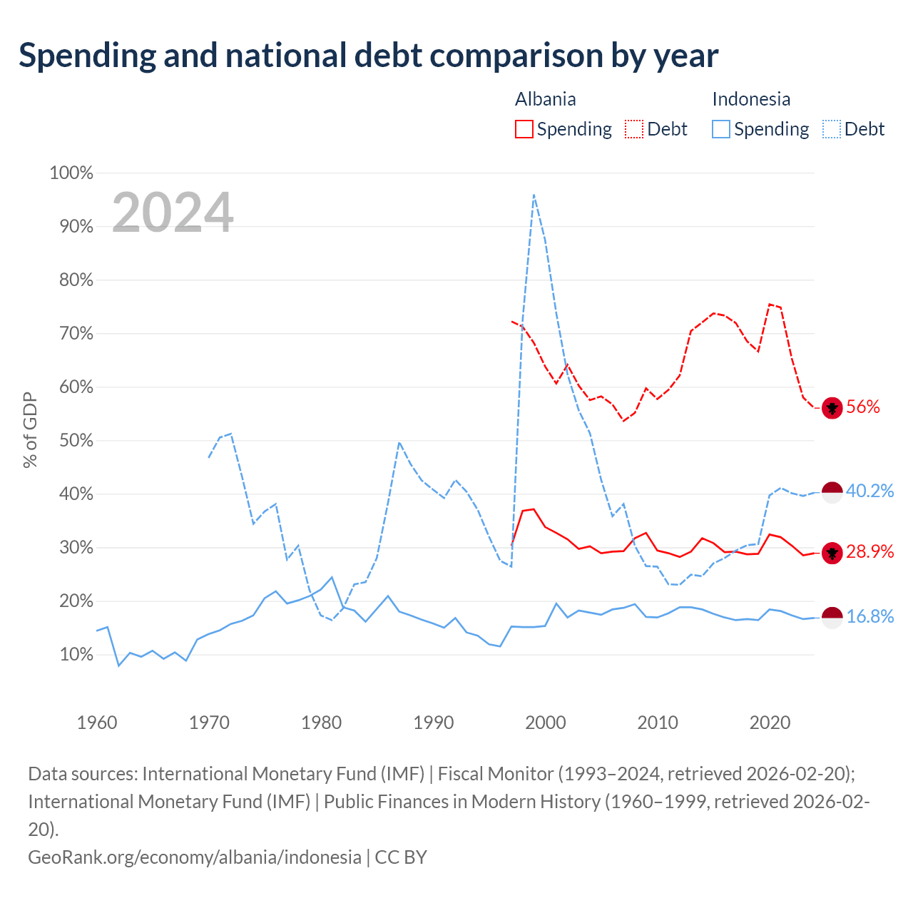 Albania has $15.2B in government debt (56% of GDP), compared to $561B (40.2% of GDP) in Indonesia.
