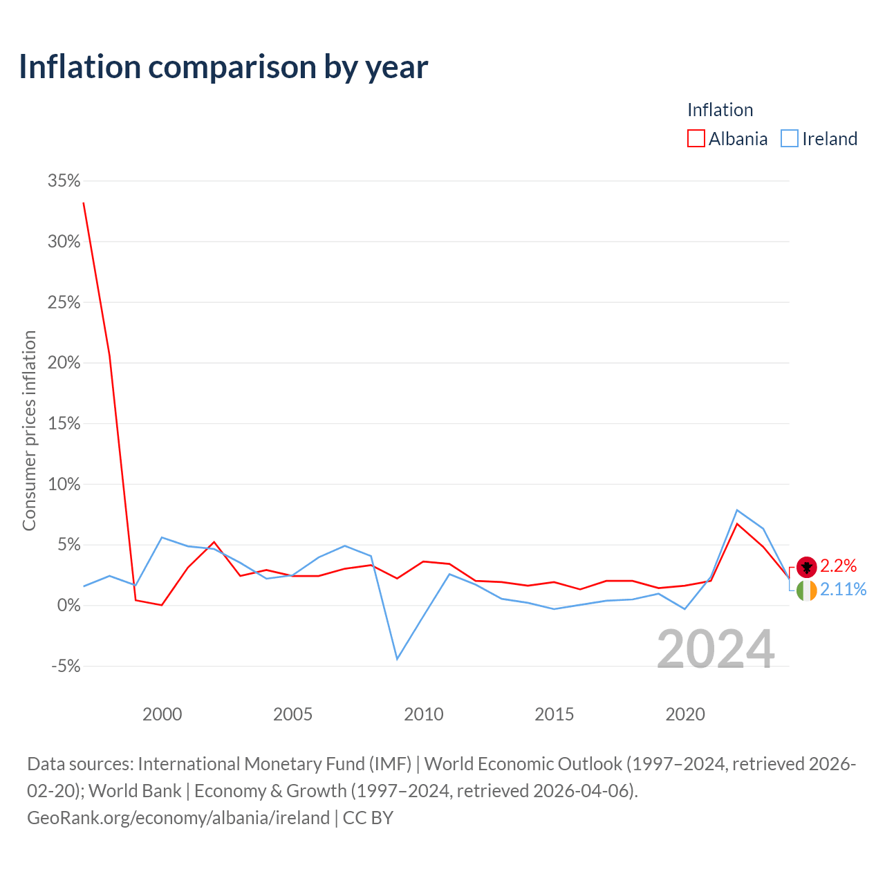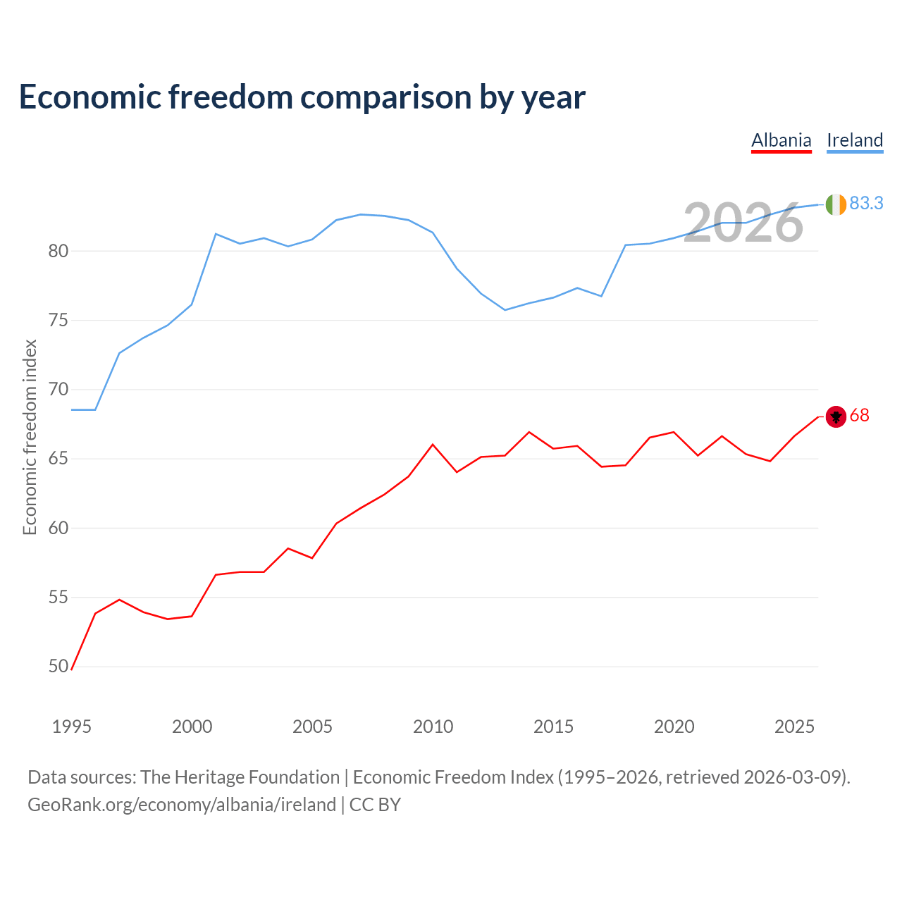 The Economic Freedom Index for Albania is 68, ranking 50/197, compared to 83.3 for Ireland, ranking 3/197. The chart above displays a comparison of annual changes in economic freedom indexes.