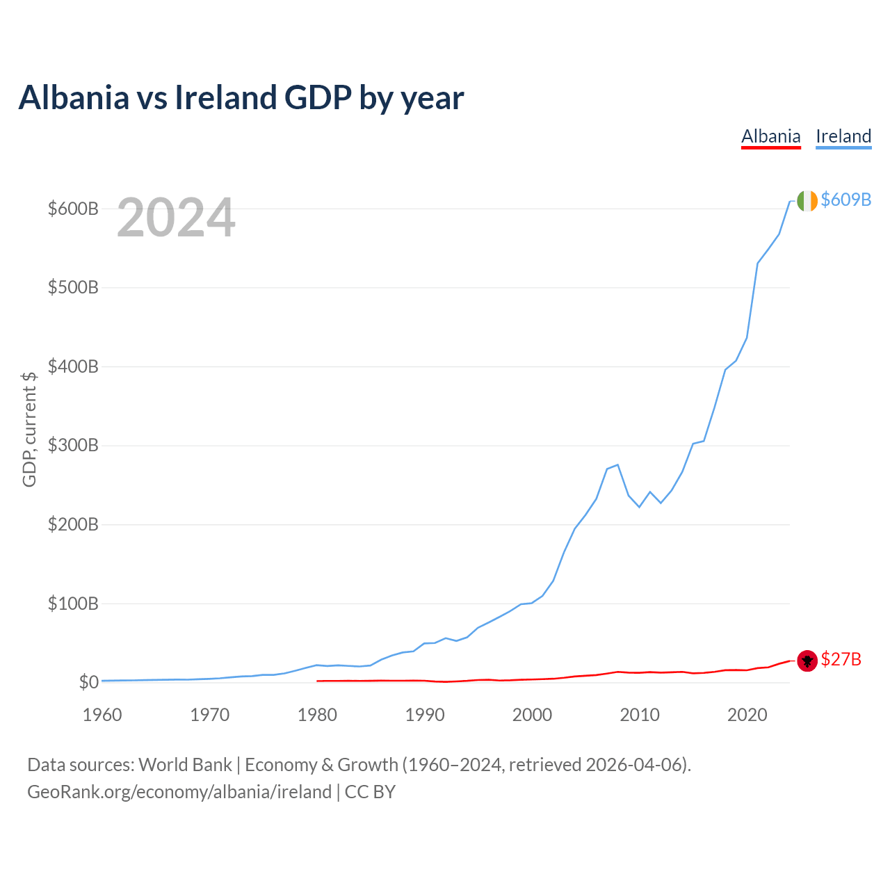 Albania has a GDP of $27B compared to $609B for Ireland, ranking 112/197 and 25/197 by economy size, respectively.