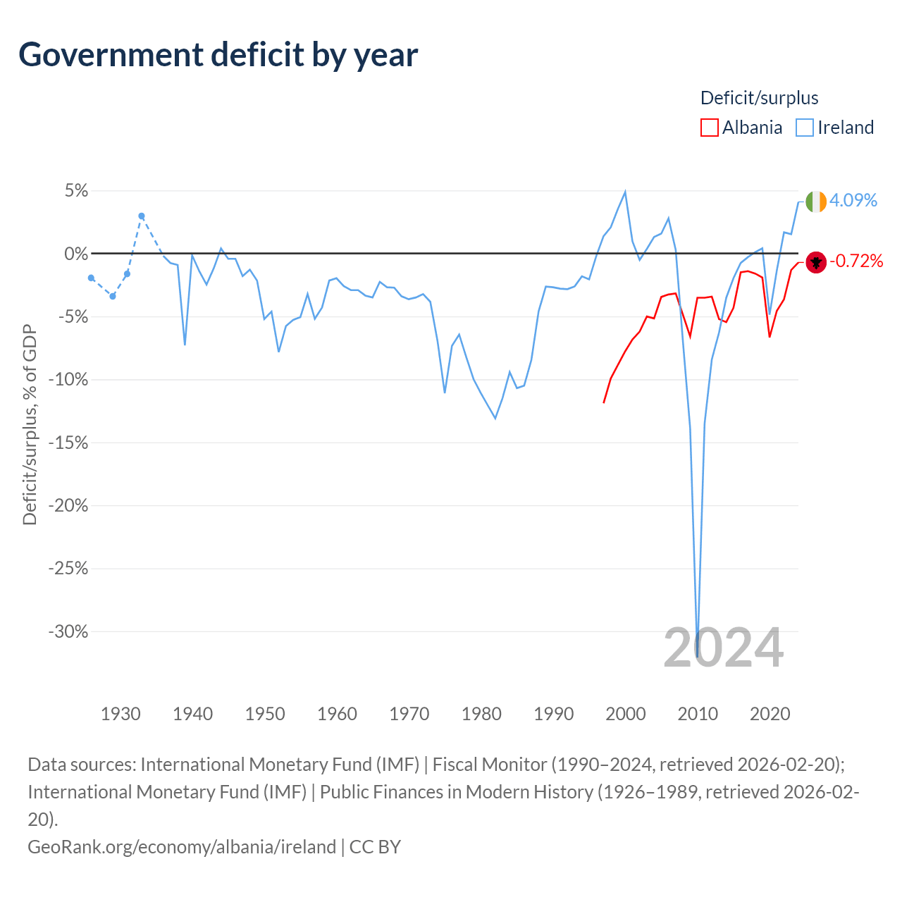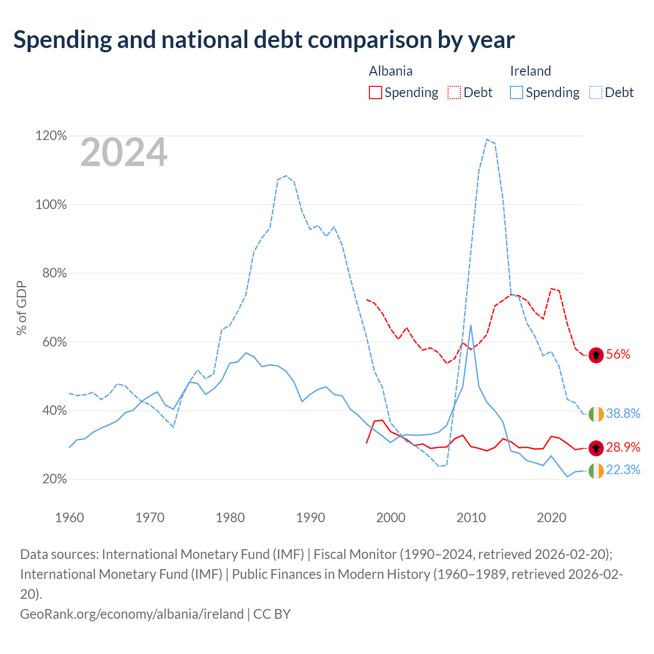 Albania has $15.2B in government debt (56% of GDP), compared to $236B (38.8% of GDP) in Ireland.