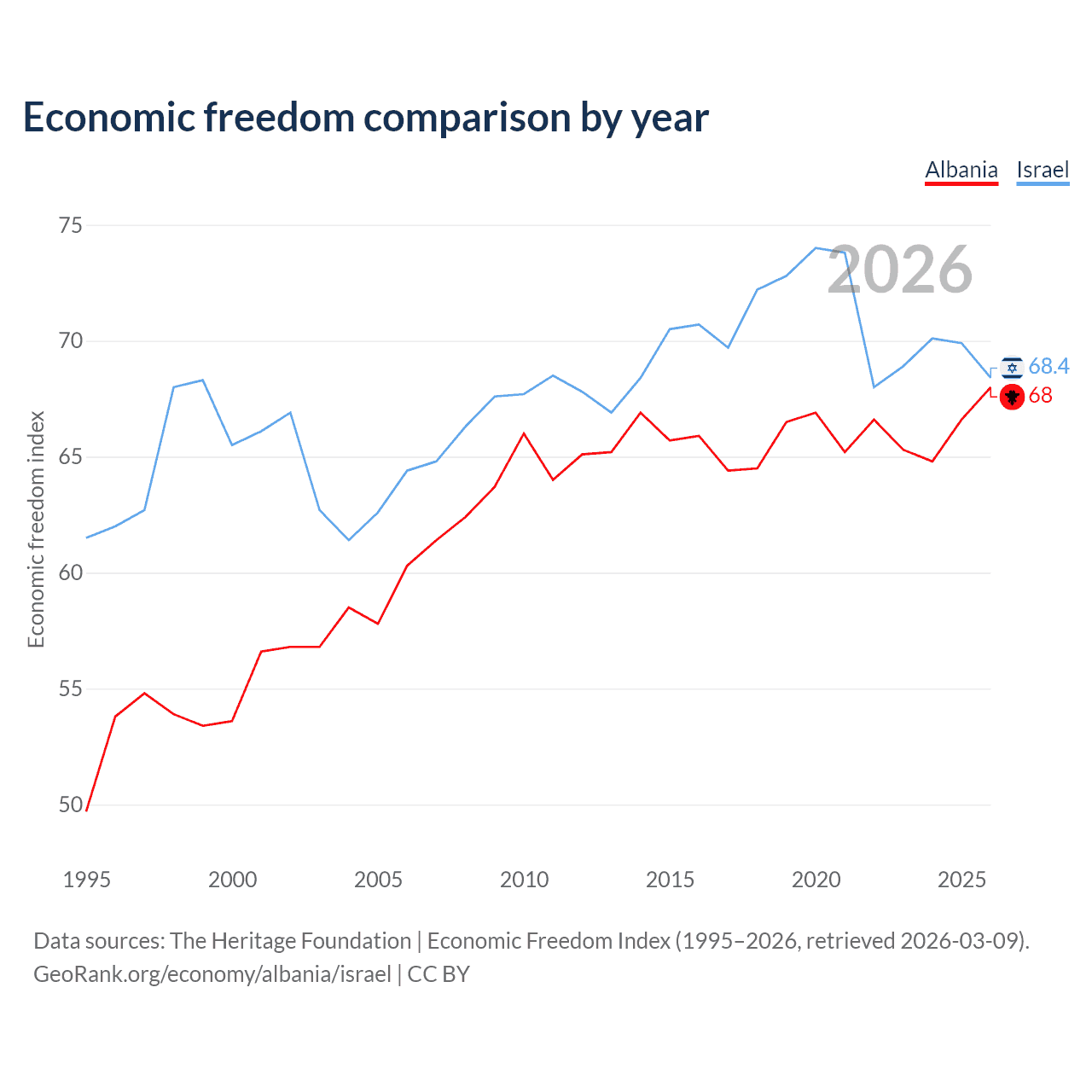 The Economic Freedom Index for Albania is 68, ranking 50/197, compared to 68.4 for Israel, ranking 47/197. The chart above displays a comparison of annual changes in economic freedom indexes.