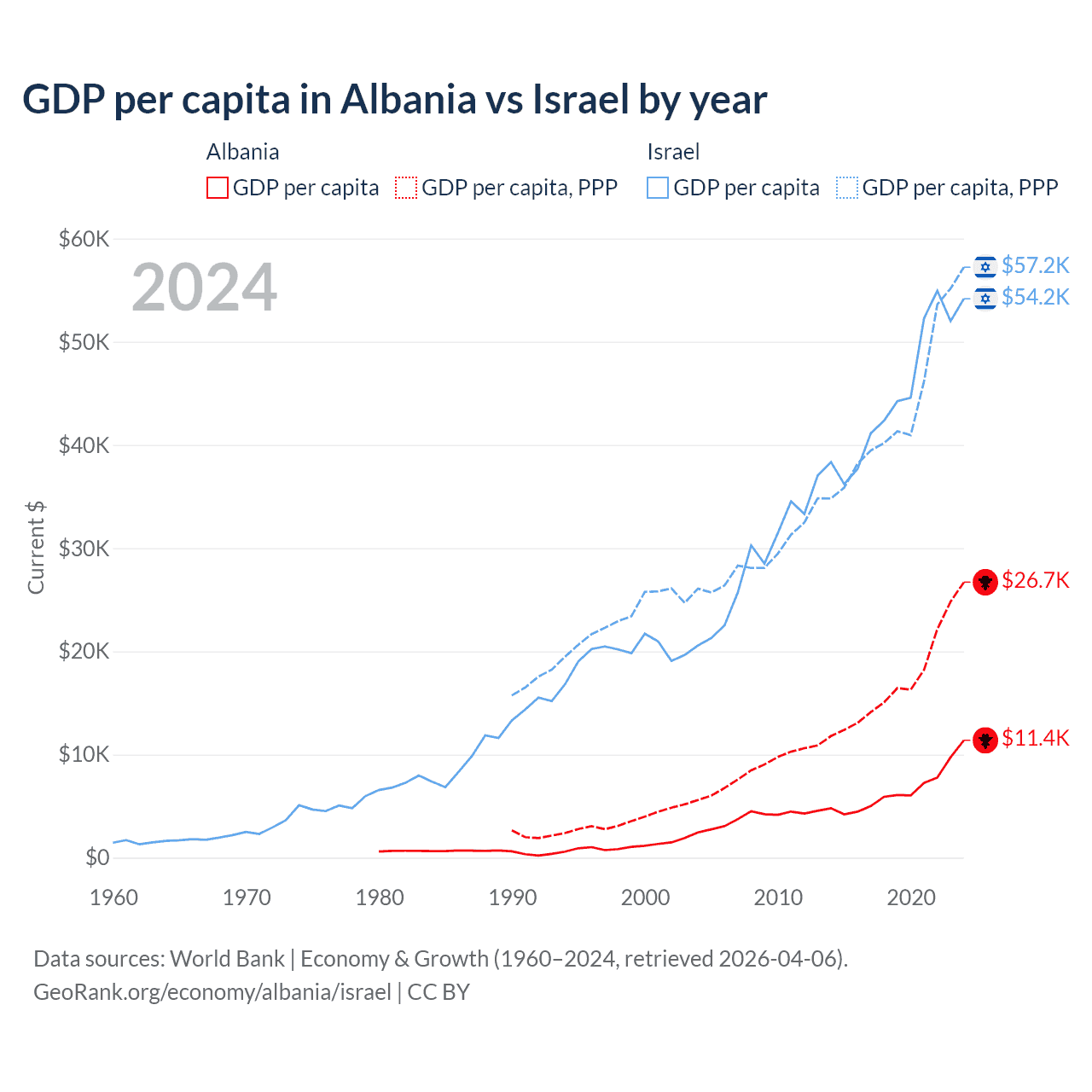 GDP per capita in Albania vs Israel by year
