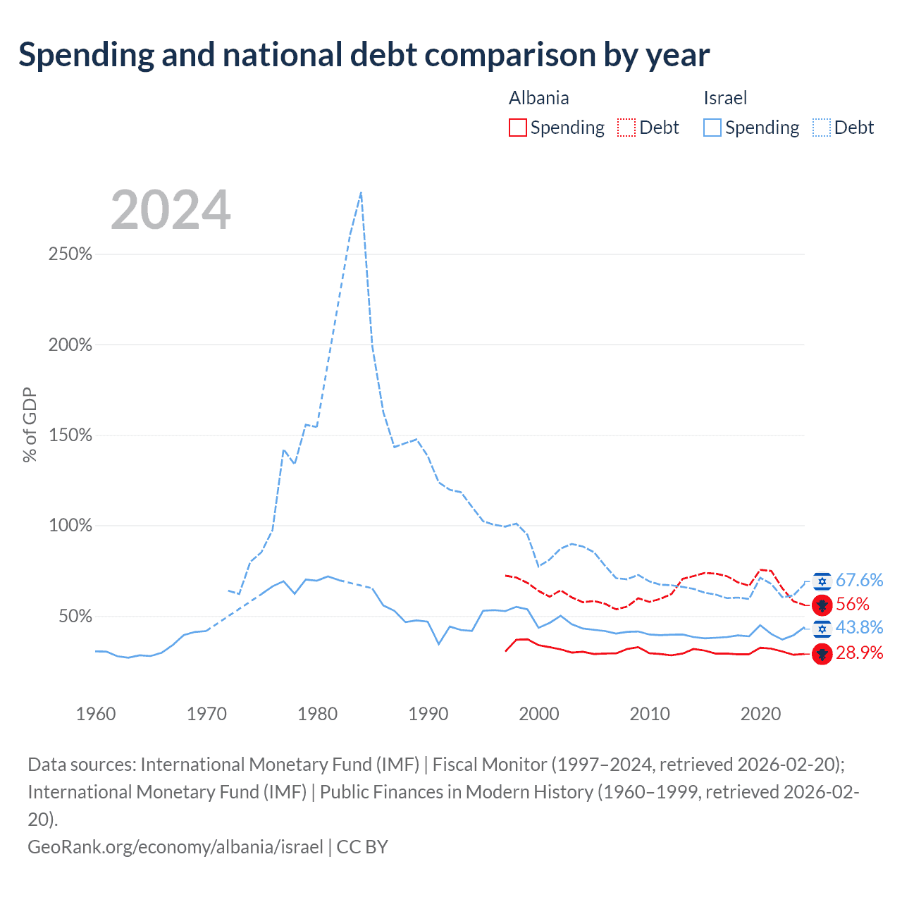 Albania has $15.2B in government debt (56% of GDP), compared to $366B (67.6% of GDP) in Israel.