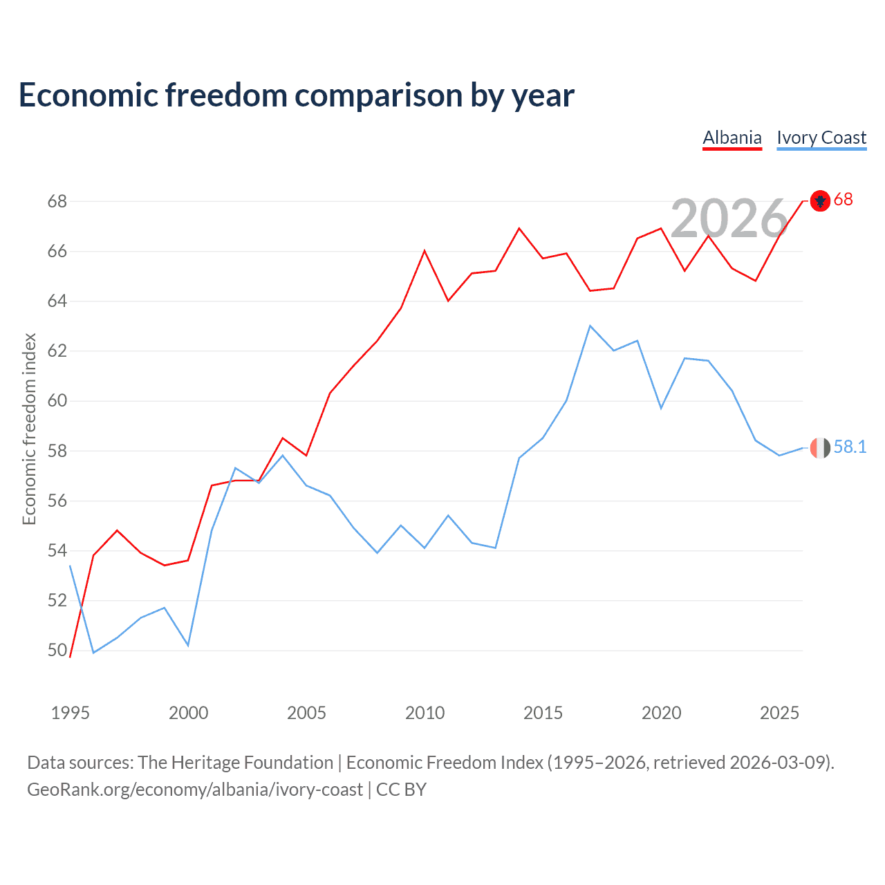 The Economic Freedom Index for Albania is 68, ranking 50/197, compared to 58.1 for Ivory Coast, ranking 111/197. The chart above displays a comparison of annual changes in economic freedom indexes.
