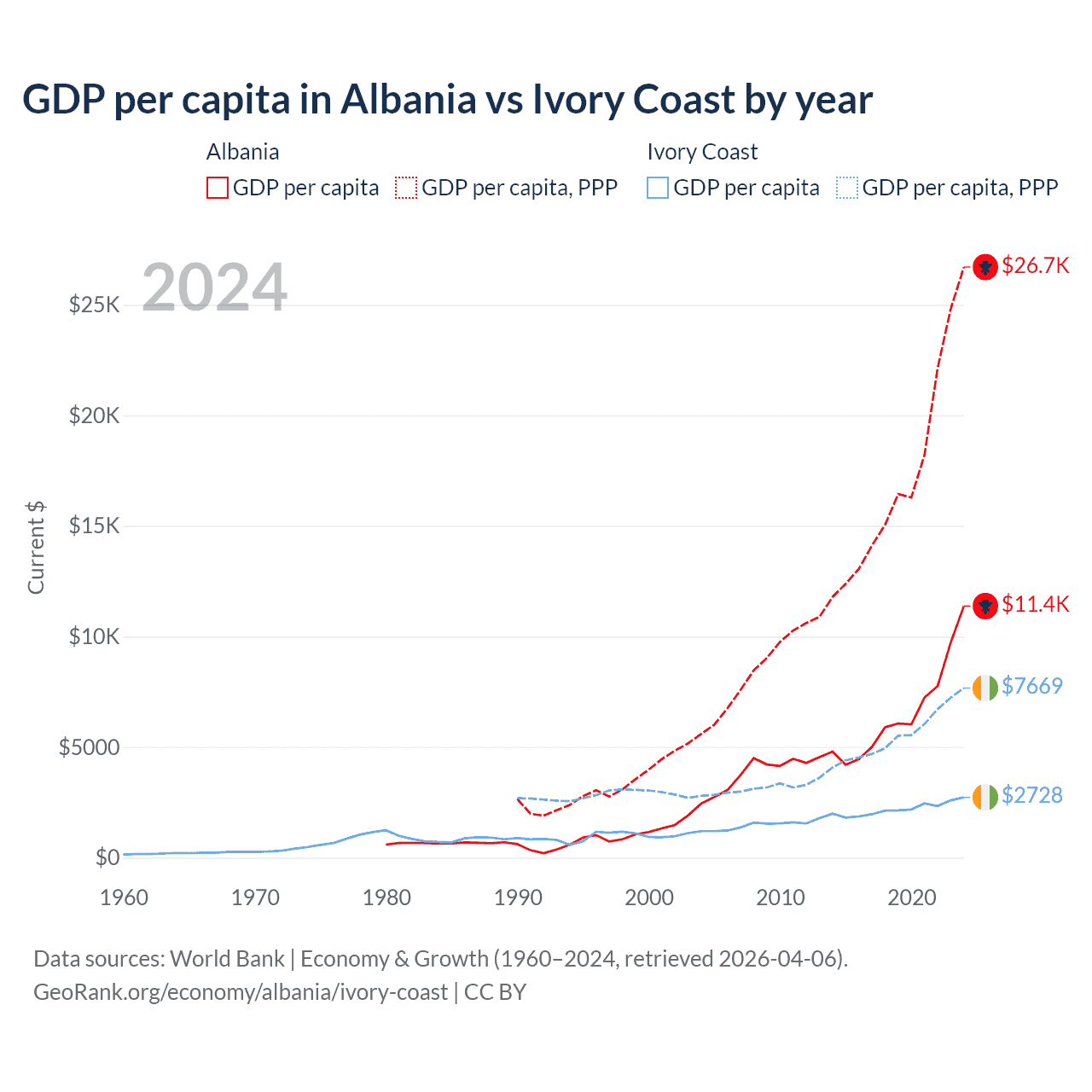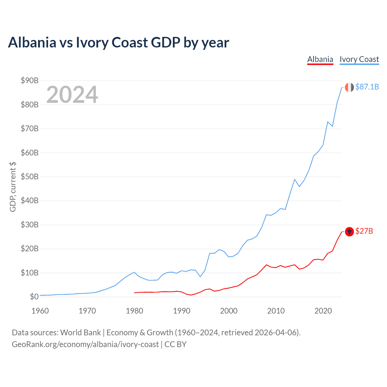 Albania vs Ivory Coast GDP by year