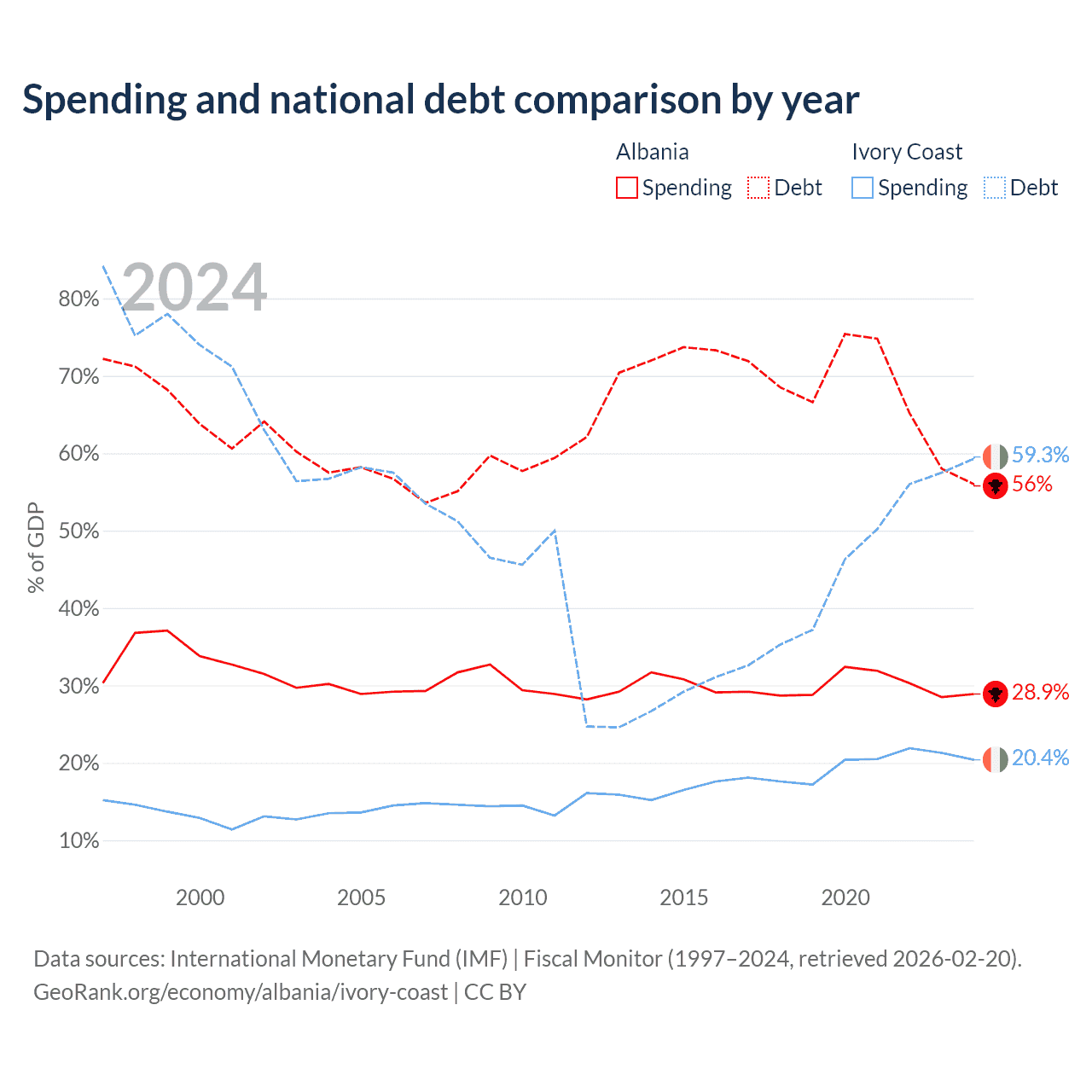 Albania has $15.2B in government debt (56% of GDP), compared to $51.6B (59.3% of GDP) in Ivory Coast.