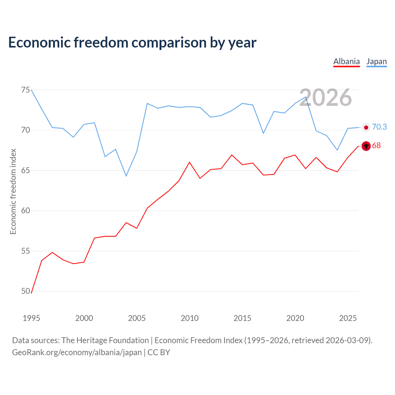 The Economic Freedom Index for Albania is 68, ranking 50/197, compared to 70.3 for Japan, ranking 36/197. The chart above displays a comparison of annual changes in economic freedom indexes.