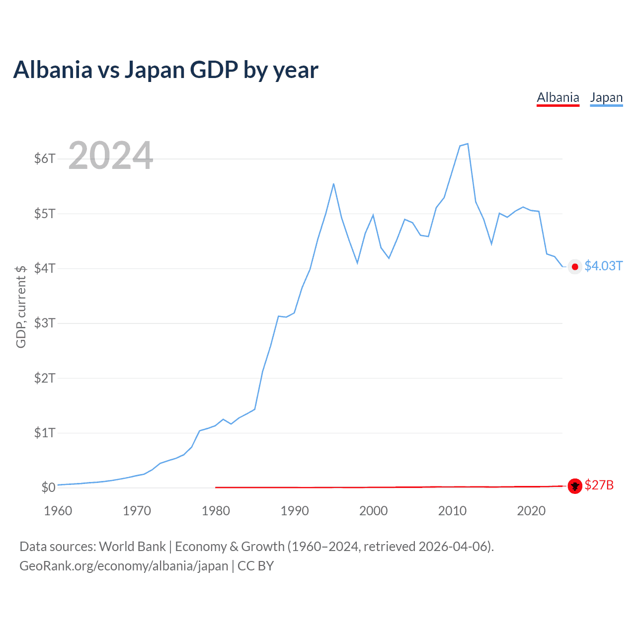 Albania has a GDP of $27B compared to $4.03T for Japan, ranking 112/197 and 4/197 by economy size, respectively.