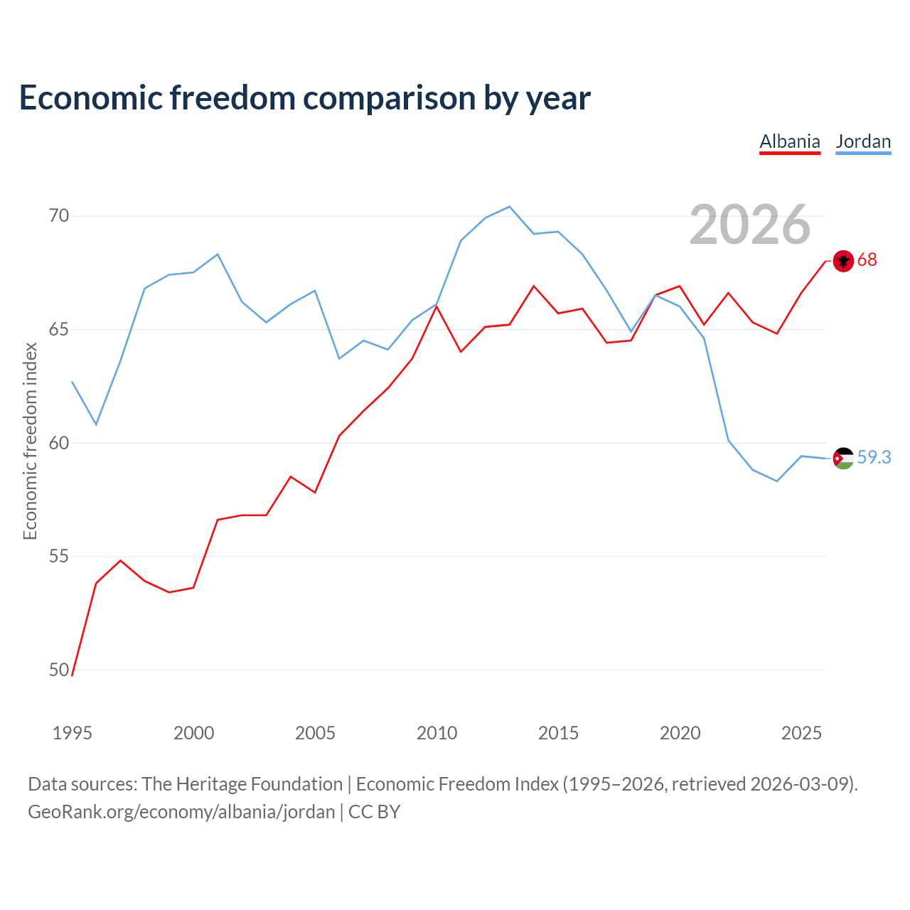 The Economic Freedom Index for Albania is 68, ranking 50/197, compared to 59.3 for Jordan, ranking 104/197. The chart above displays a comparison of annual changes in economic freedom indexes.