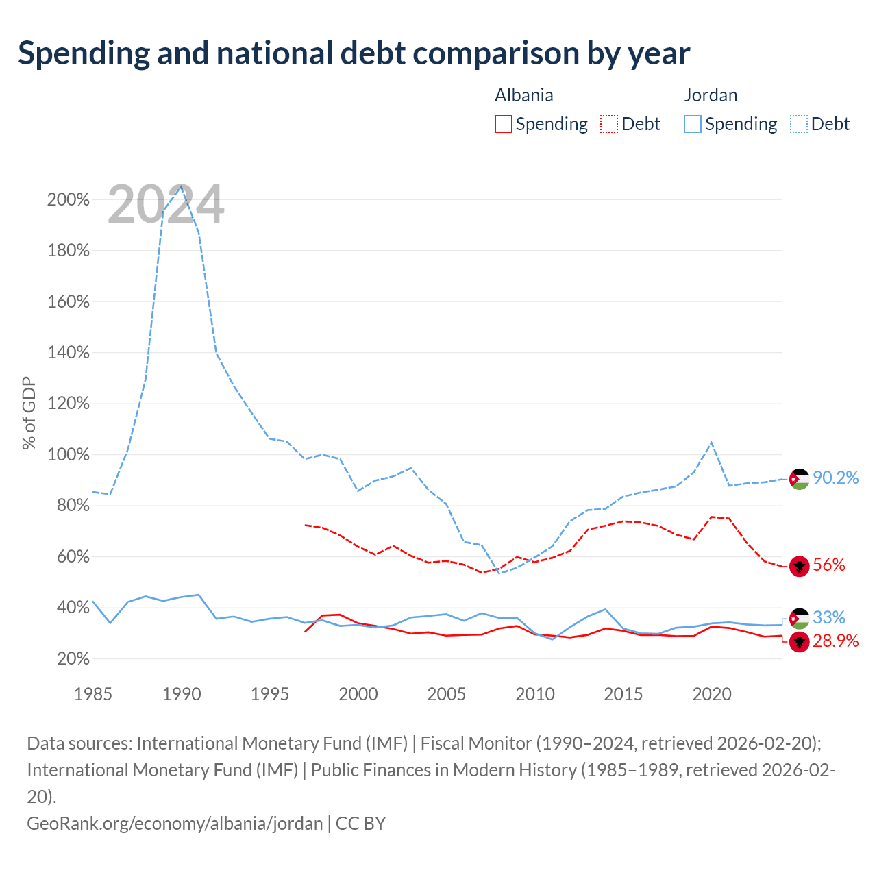 Albania has $15.2B in government debt (56% of GDP), compared to $48.1B (90.2% of GDP) in Jordan.
