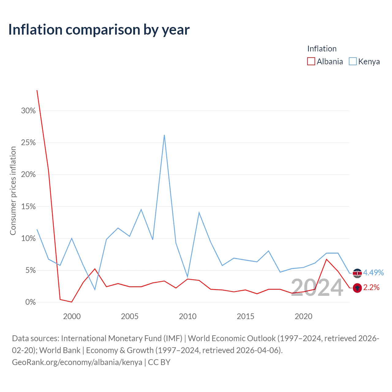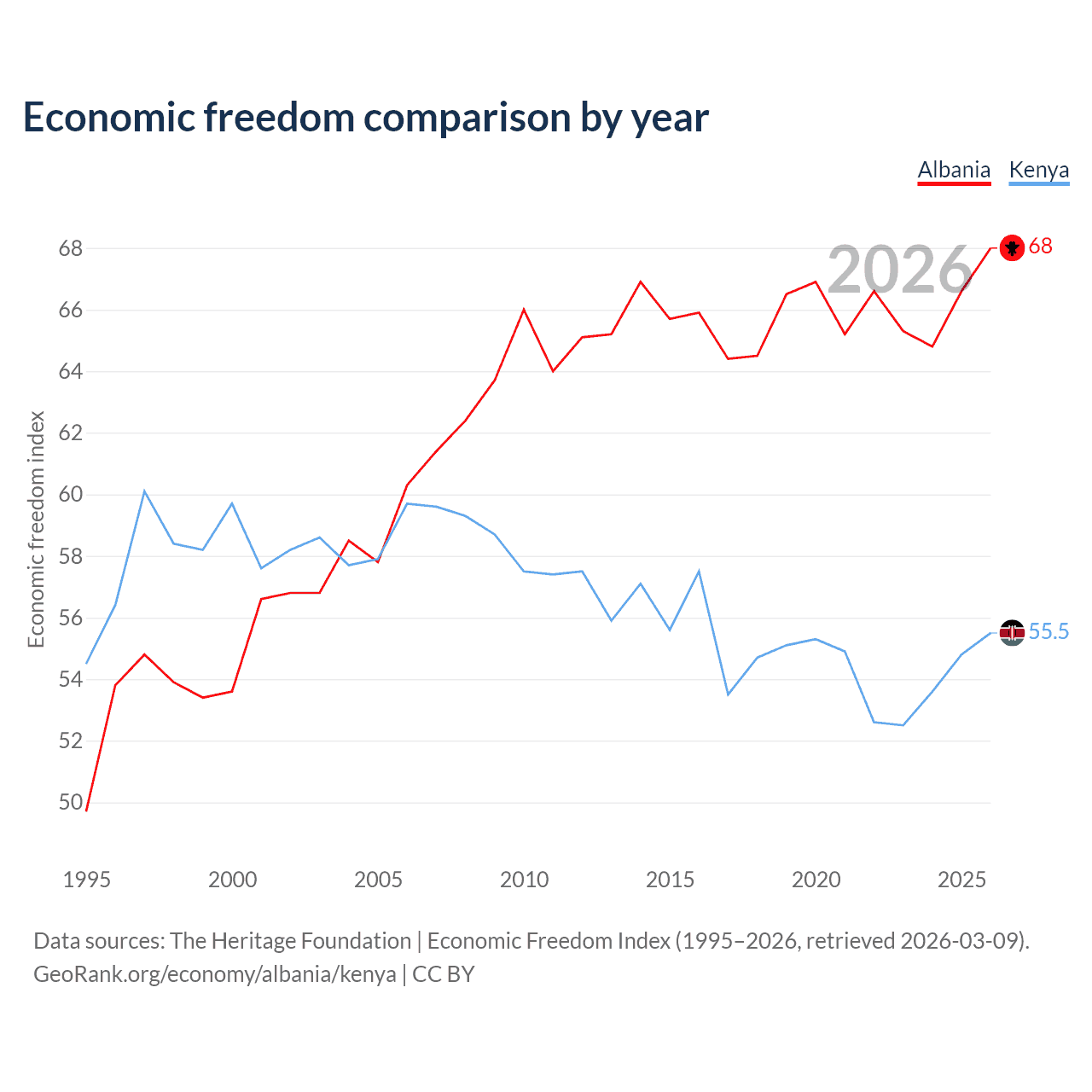 The Economic Freedom Index for Albania is 68, ranking 50/197, compared to 55.5 for Kenya, ranking 128/197. The chart above displays a comparison of annual changes in economic freedom indexes.